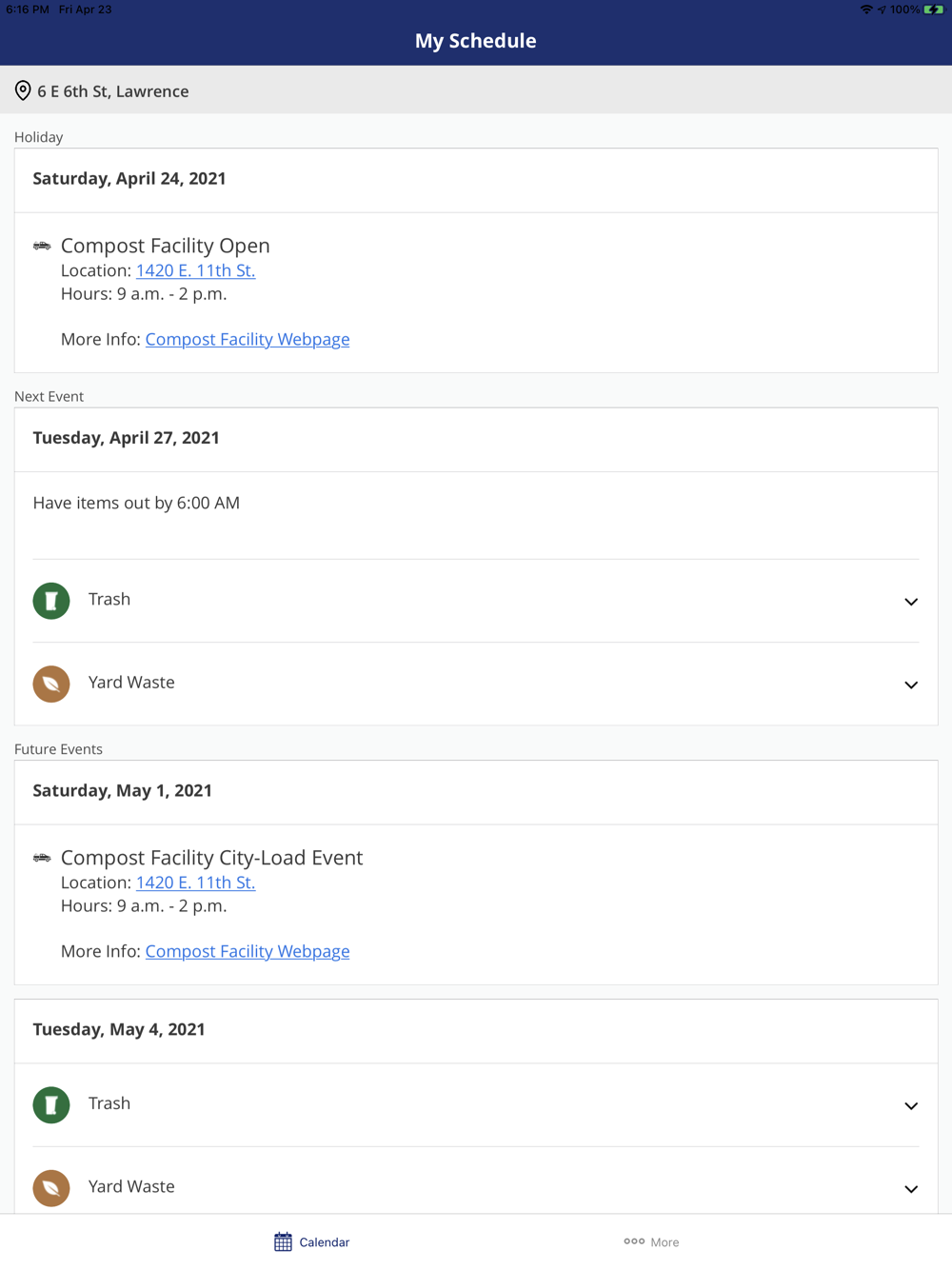 Garbage and recycling schedules and reminders for City of Lawrence. View your garbage and recycling schedule and receive collection notifications all from within this app.
