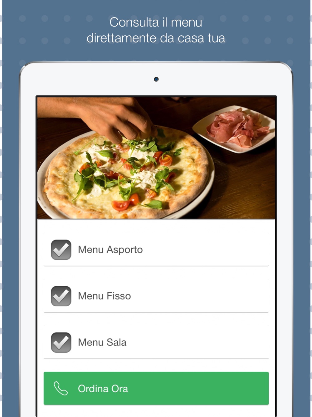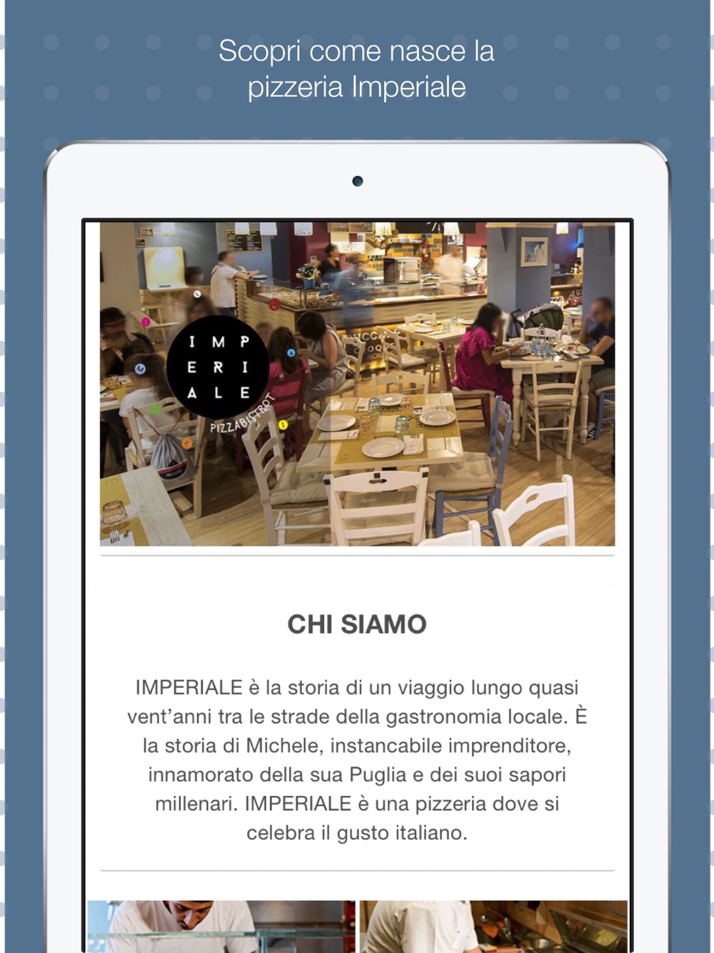 Sfoglia il menù gourmet di Pizzeria Imperiale direttamente dal Tuo smartphone e prenota il tavolo e la sala per la Tua serata.