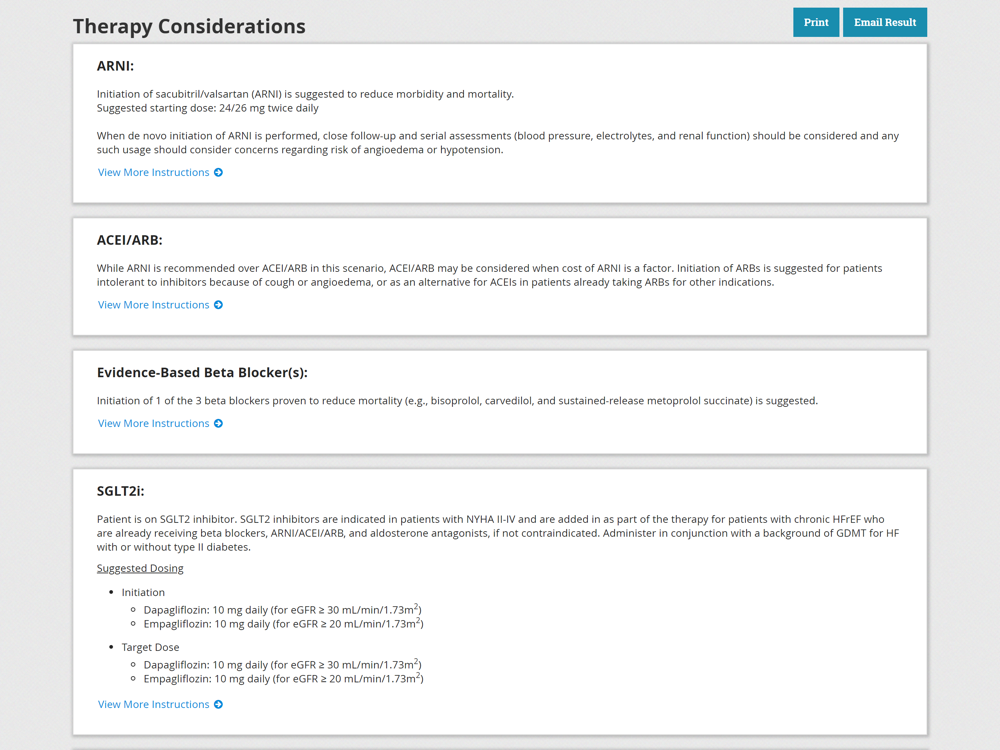 TreatHF helps clinicians confirm which therapies are suggested for their symptomatic heart failure patients with reduced ejection fraction (stage C HFrEF), and provides guidance on the use of each therapy.