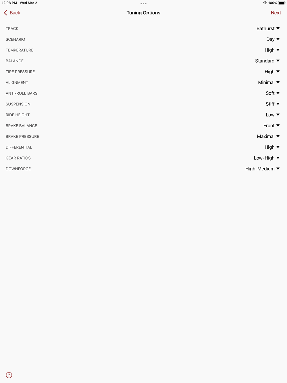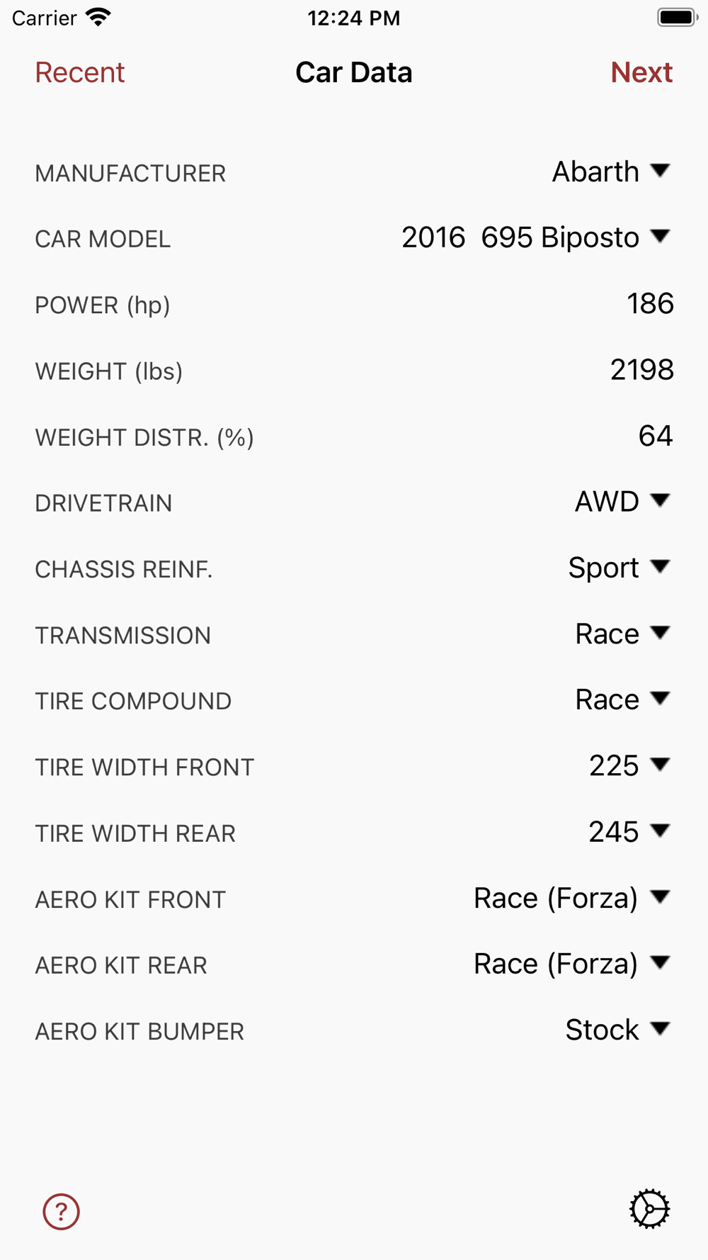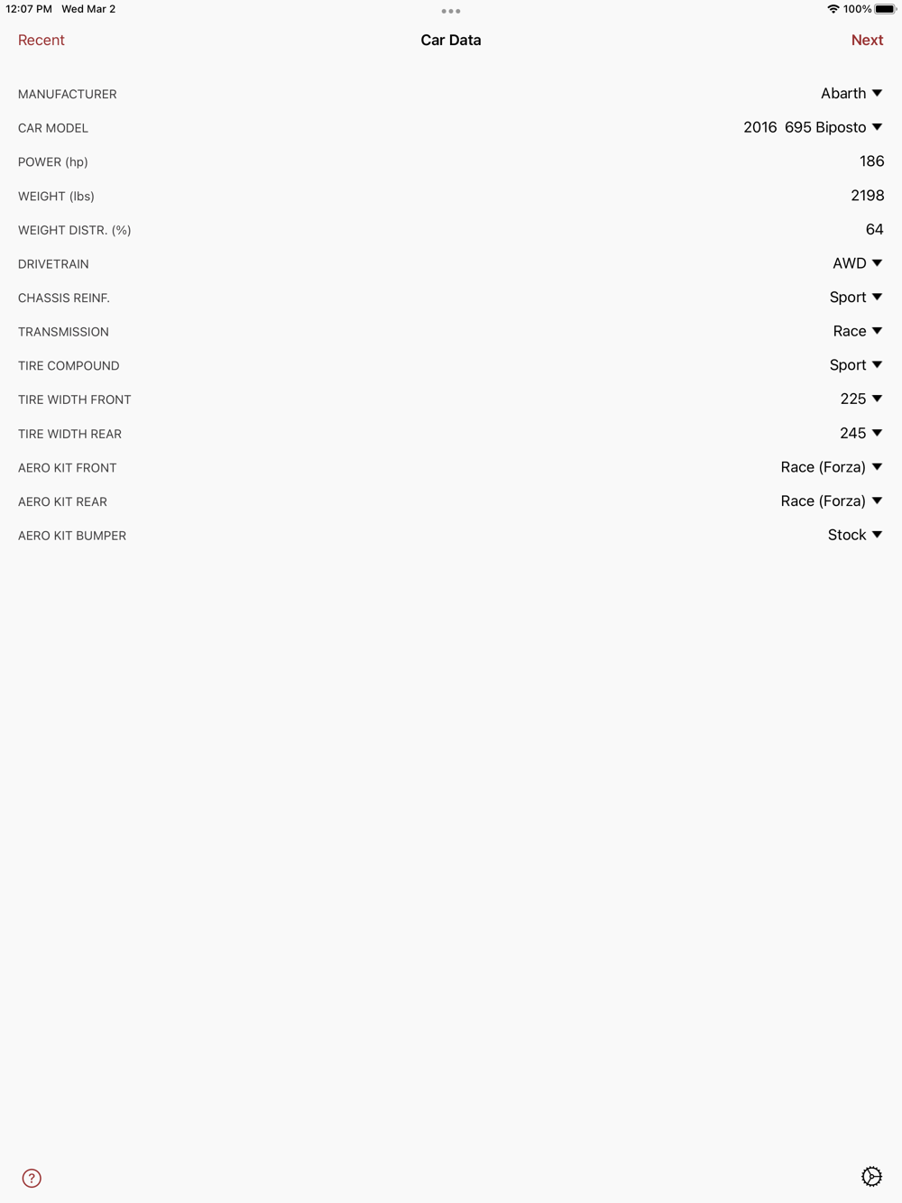 Based on the provided data a tune is calculated. ARBs and spring rates are provided with 3 fraction digit precision, set the in-game values to nearest value.