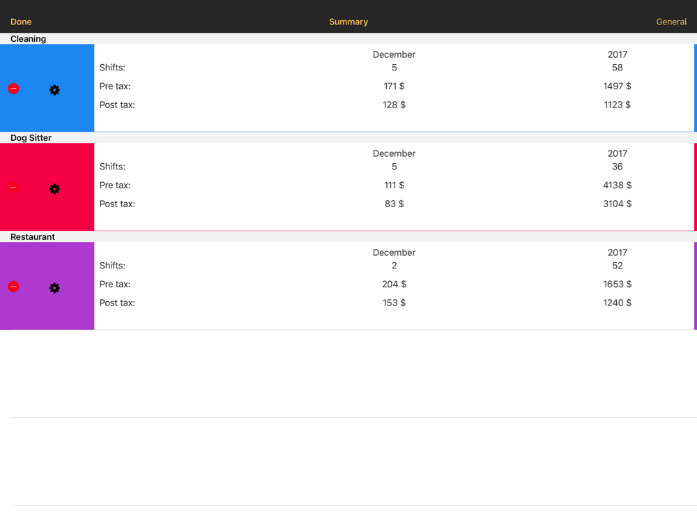 Laboro will automatically calculate your income and generate time sheets from your existing calendars. Just type in your salary, overtime bonus and personal information, and your income will be calculated from the shift that already exist in your calendar. The premium version allows you to export time sheets and mail them directly to your employer.