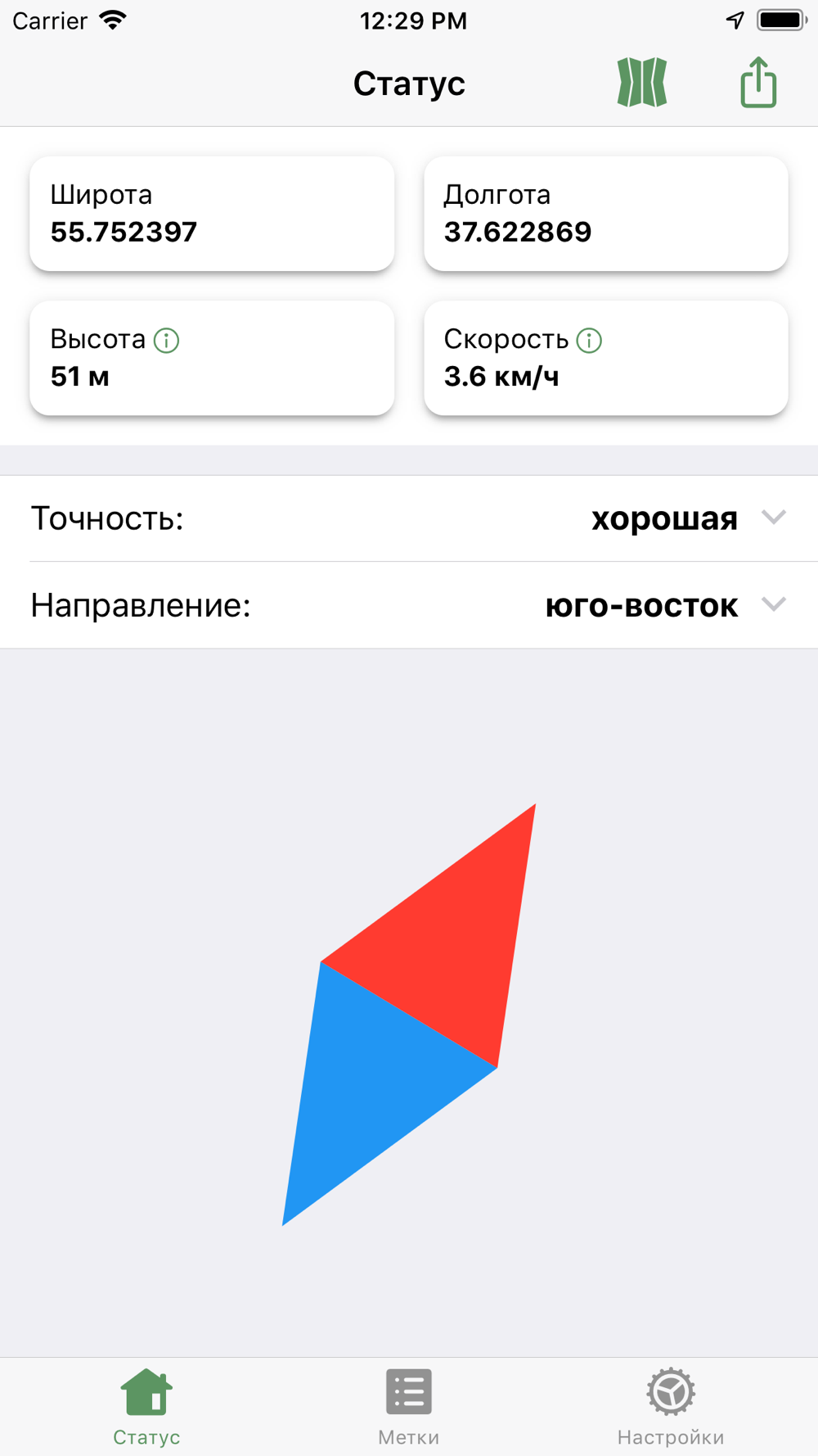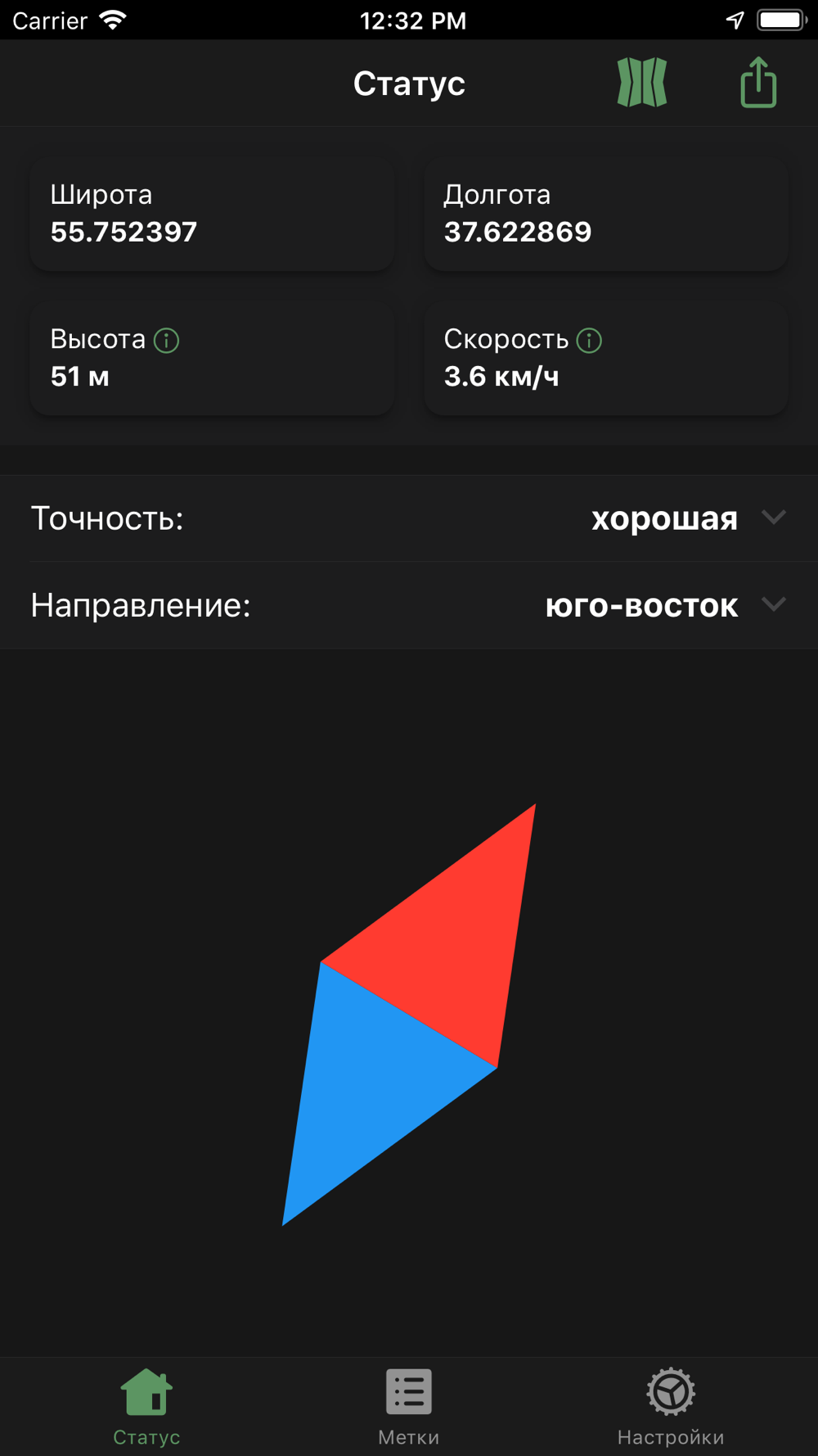 - Отображение текущих координат, высоты над уровнем моря, скорости, точности данных и стрелки компаса.