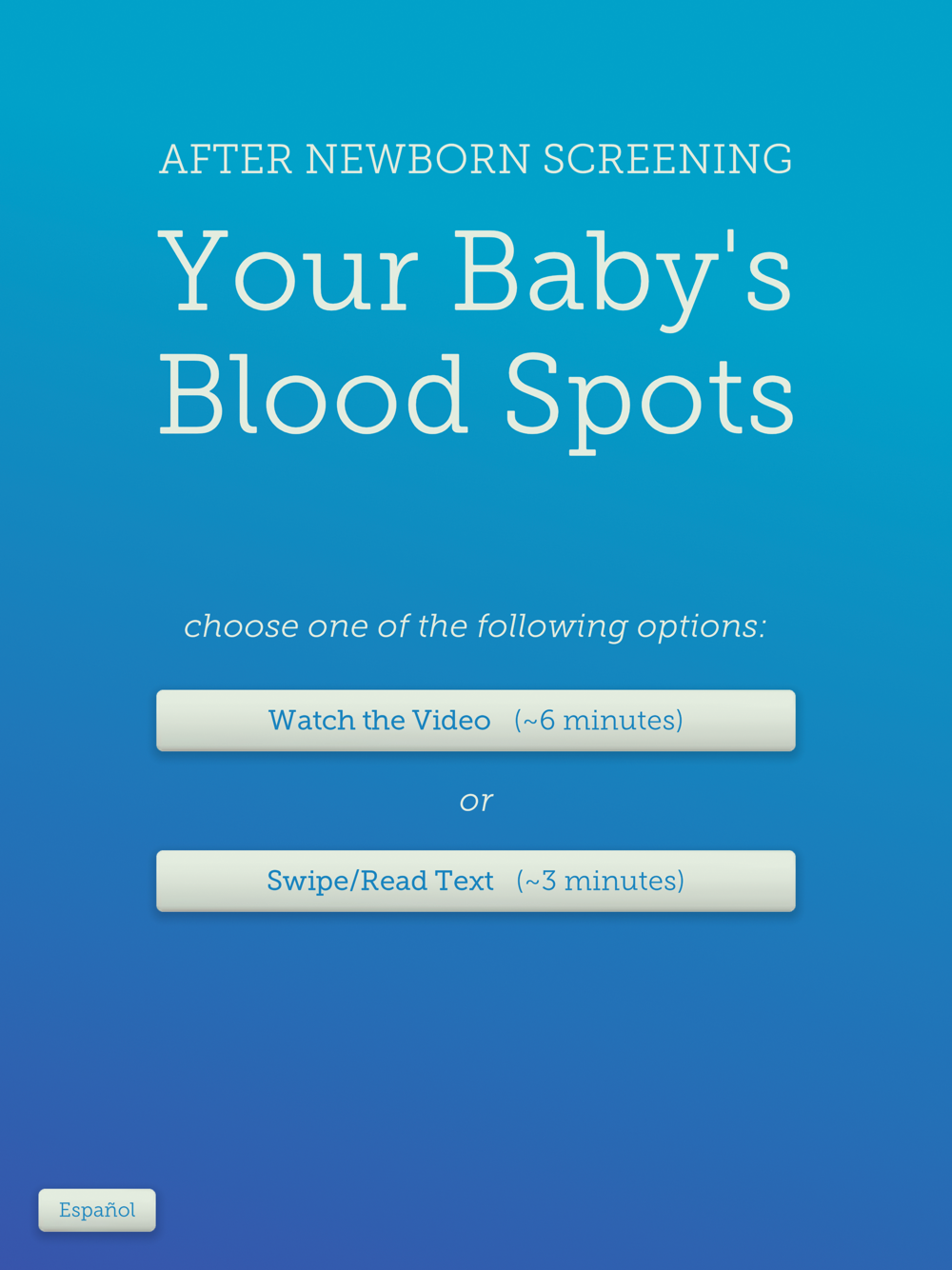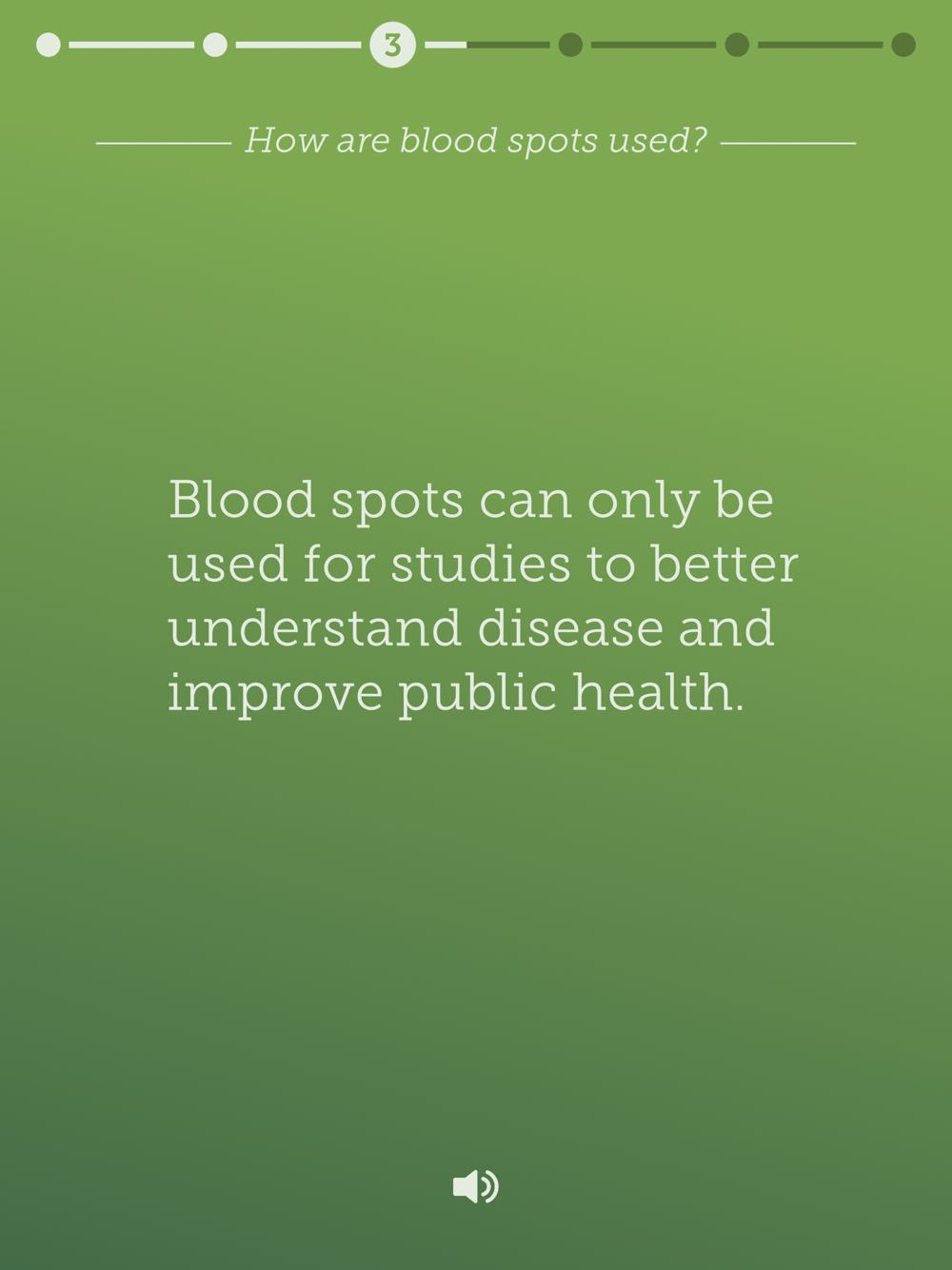 The purpose of this app is to provide information about the research use of leftover bloodspots after newborn screening is completed. The app is designed to accompany informed consent. Every state health department has different policies regarding the retention and use of leftover bloodspots, and this app provides the general information in order for an individuals to make an informed decision that can support different health departments policies. The information contained in the app was tested in a randomized control trial in Michigan, with results indicating that the app significantly improved knowledge and participants were significantly more satisfied with the consent process compared to the standard consent process. The app includes an optional 5-minute video, voiceover for all text, and a Spanish-language option. Links are provided to additional information at the end in case users still have questions.