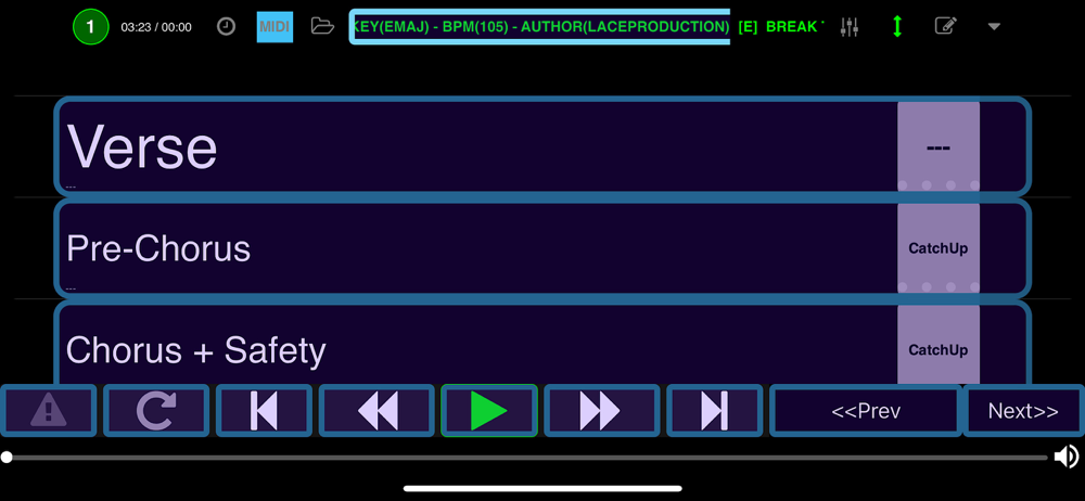Eg. In the event a performer mistakenly starts singing a wrong section & is say 3 bars into this section , don't panic just press the catch up button on the correct section and the track automatically continues playing 3 bars into the correct section whilst synced to the beat.