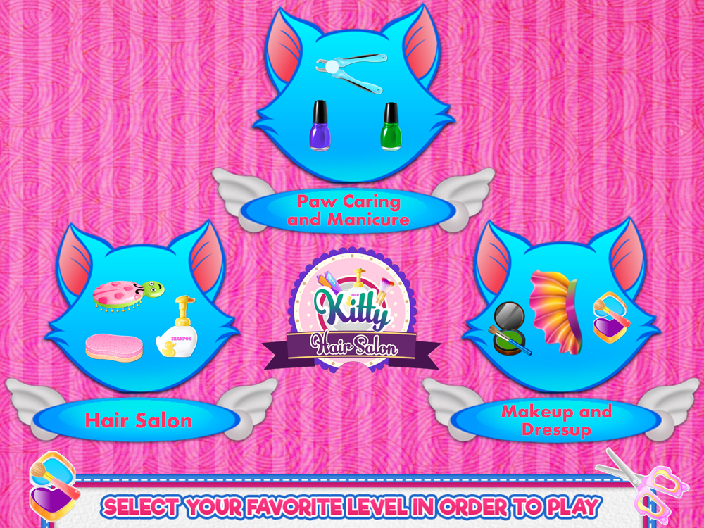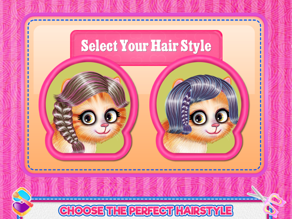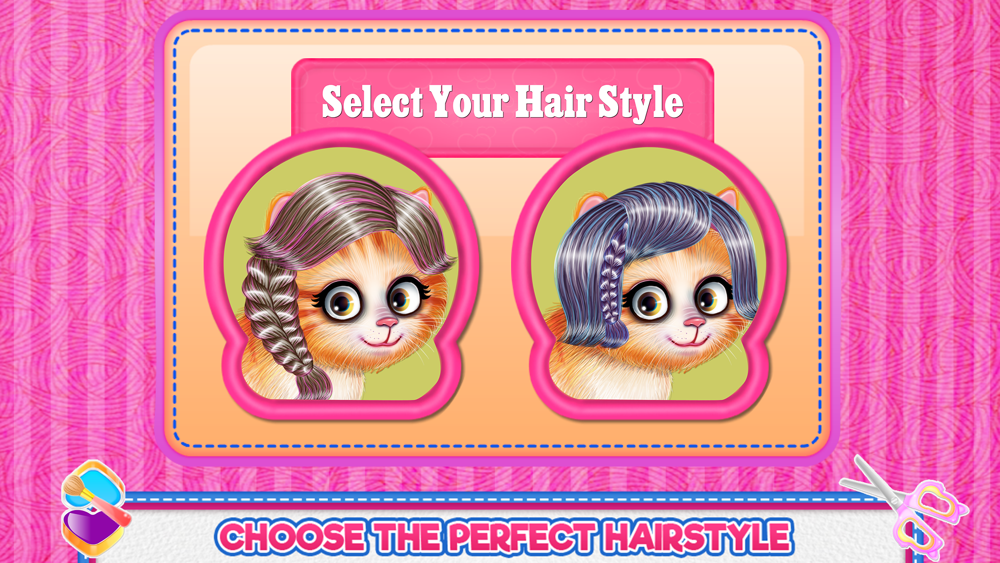 Your job as an animal caretaker has multiple responsibilities and because you love to spoil each creature that comes to your spa salon, you dedicate your life to embrace this. More than anything this cat game will teach you how to do a proper caring session for a kitty's hair and besides the hairstyling you will get to find the way her nails should be treated and designed. There is also a dressing up step where you will play with colors and add pretty accessories to match them with the new and refreshed hairstyle you have just made. Prepare yourself for a composed challenge and get this done using your skills as a pet salon owner. First, you will go with the hairstyle you want to perform and once you choose it you will get the kitty in the chair for future transformations. Cut the damaged hair and then wash it well. Arrange it, brush it and execute the braided strand or if you choose the other type of hair you just have to follow the arrows that will guide you to tie the hair as it should be done. Next comes the manicure part where you will be cleaning her paws and cut the extra nails. Once you do that you could design the nail style you want for each paw. Choose the color and apply some sparkling stickers or why not some precious stones to make it look fancy. Now you have to take care of one more step that is the makeup and clothing one. Feel free to use your artistic spirit and use the colors you want for the eyeshadow and the eyes. Put on a unique dress and match some glittering accessories to it.