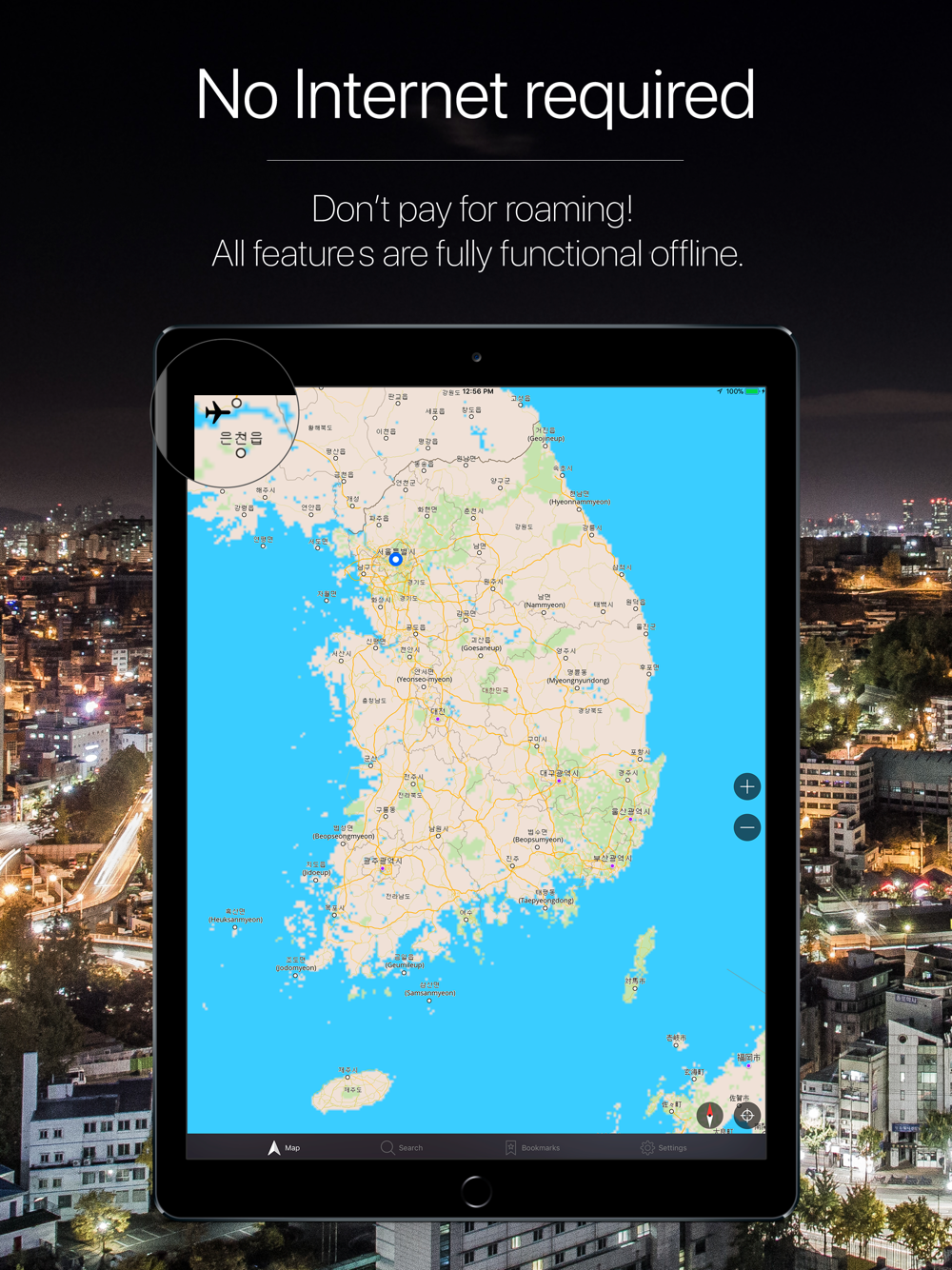 The App contains detailed maps of the biggest cities in South Korea: Seoul, Busan, Incheon, Daegu, Daejeon, Gwangju, Suwon, Goyang-si, Seongnam-si, Ulsan and others.