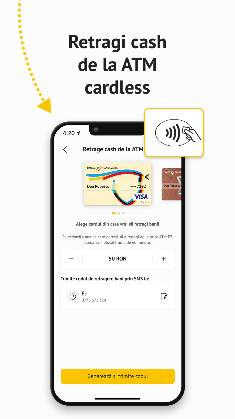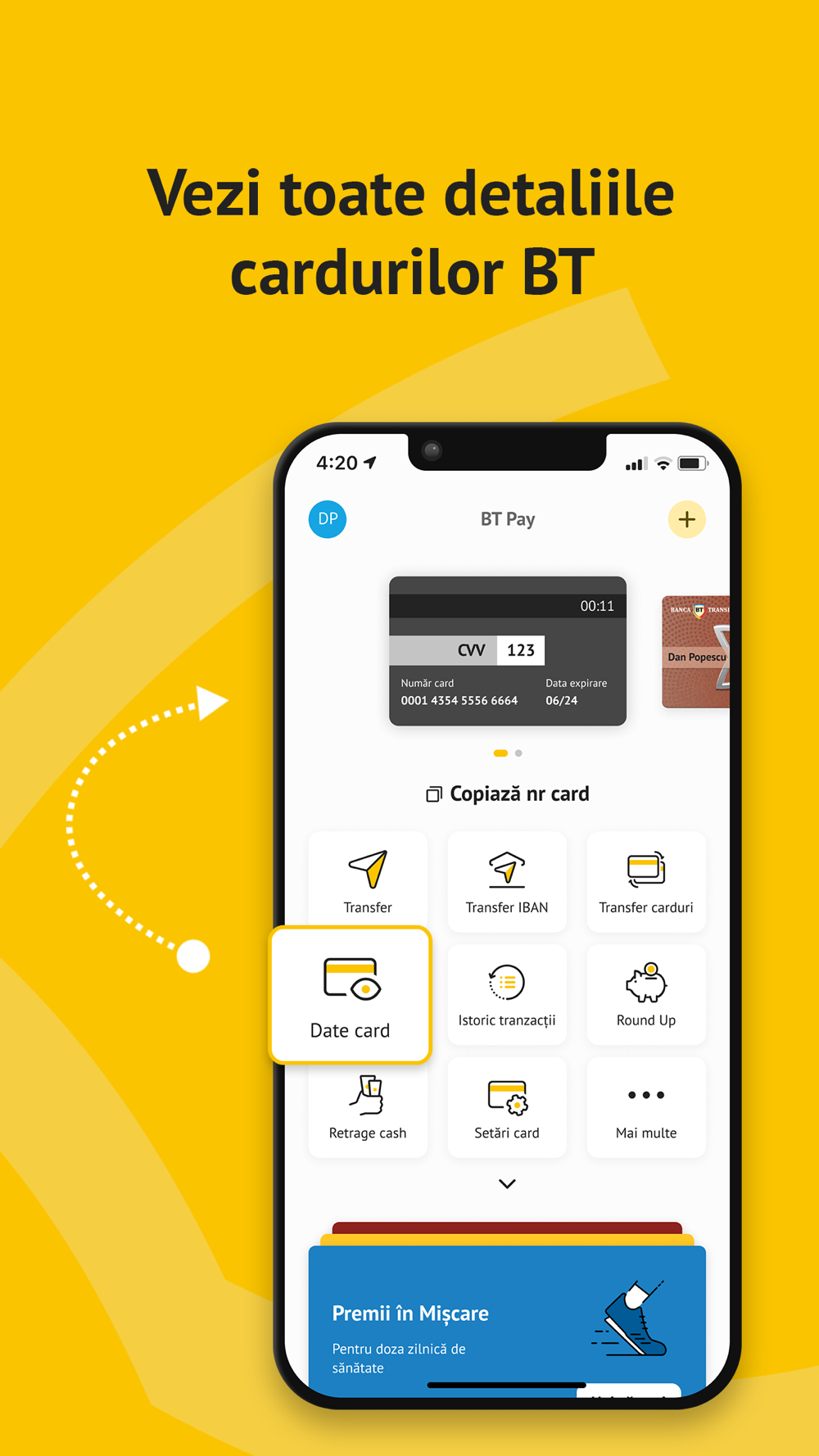 • Poti transfera bani intre conturile cardurilor tale BT;