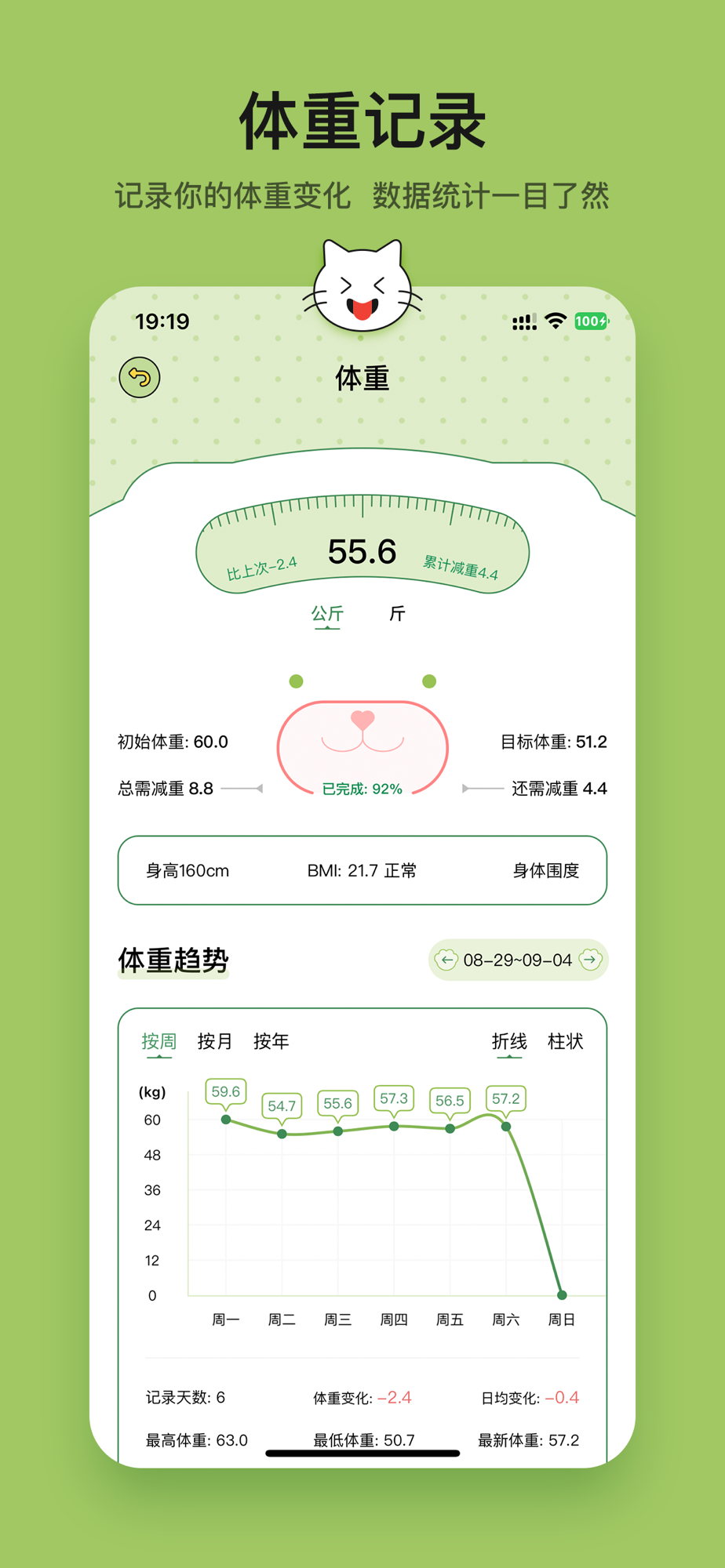 生活中,有人要减肥,也有人需要增肥,无论你属于哪一种,我们都应该时刻关注自己的身体健康状况,不盲目减肥或增肥,小懒喵更注重记录身体的健康数据,它通过简单、优雅的界面可以让你非常轻松的查看体重趋势、喝水记录、睡眠数据等等,并且支持实时追踪你的饮食或断食数据,帮你健康的实现减脂或增重的目标。
