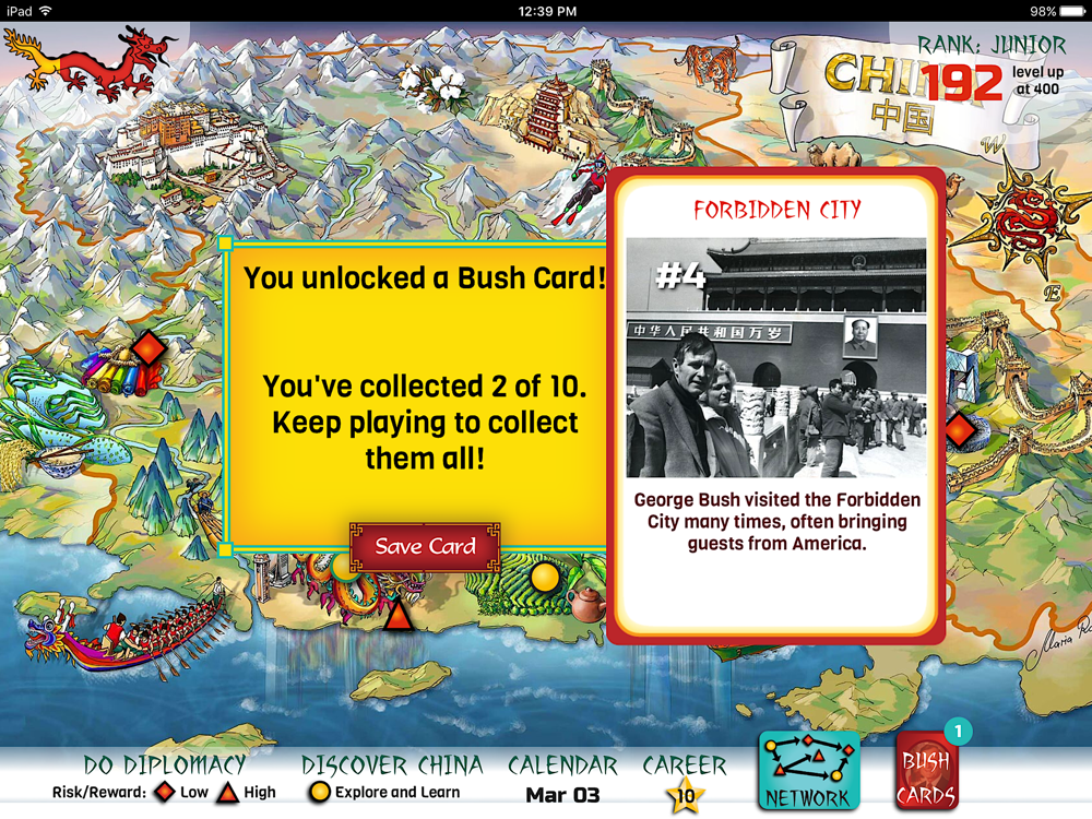 This game is inspired by George H.W. Bush’s time as the chief U.S. diplomat in China, from 1974 to 1975 — a formative period for the future president. Players earn “Bush Cards” as they play, highlighting his time in China and emphasizing the many things diplomats do to build positive relationships.