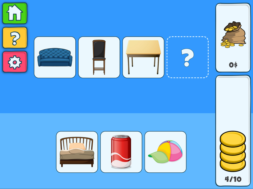 I "Hva passer?" skal spilleren finne bildet som passer sammen med de andre bildene og dra det opp til den tomme boksen.