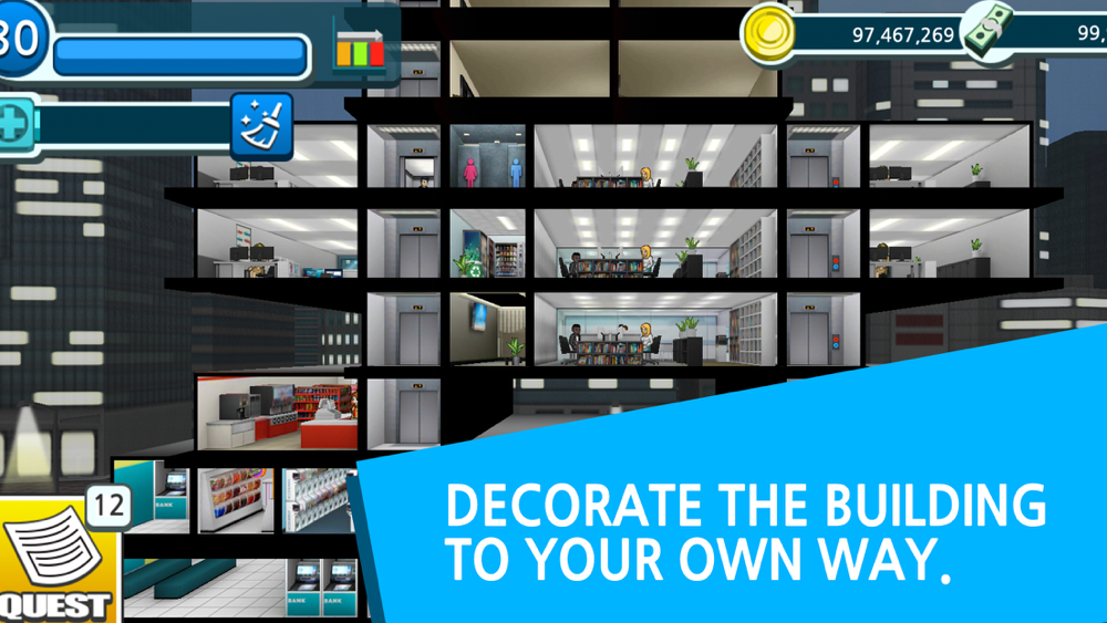 Casual building construction simulation that can get profit automatically by installing various facilities in building.