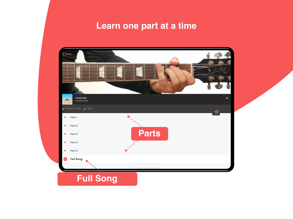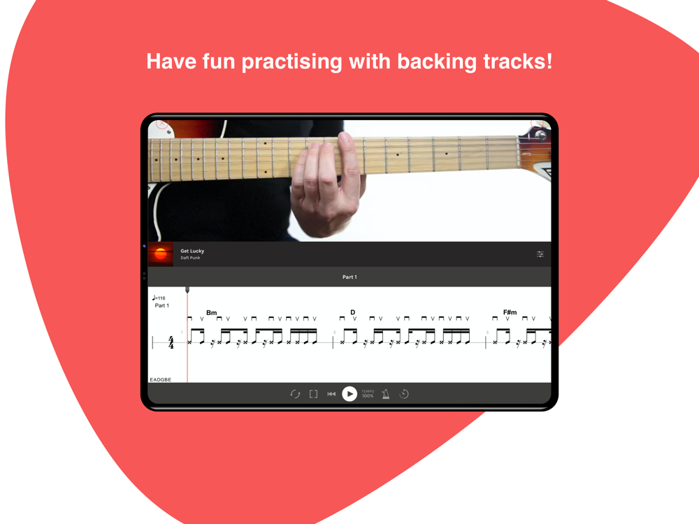 Learn easily with simplified scores available in standard notation, tablature, or neck view.