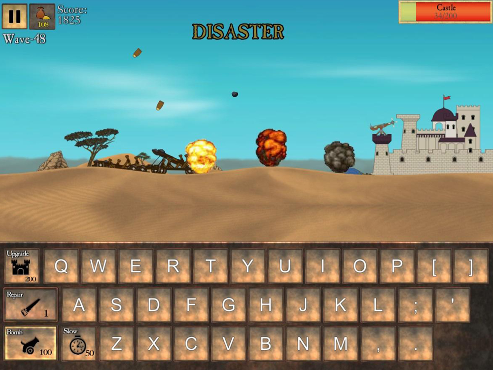 Each time you write a shown word, the ballista fires to an enemy. The enemies keep coming in waves and you have to write words fast. You can upgrade and repair your castle if it is damaged. There are also two powers which can help you when you are having an hard time.