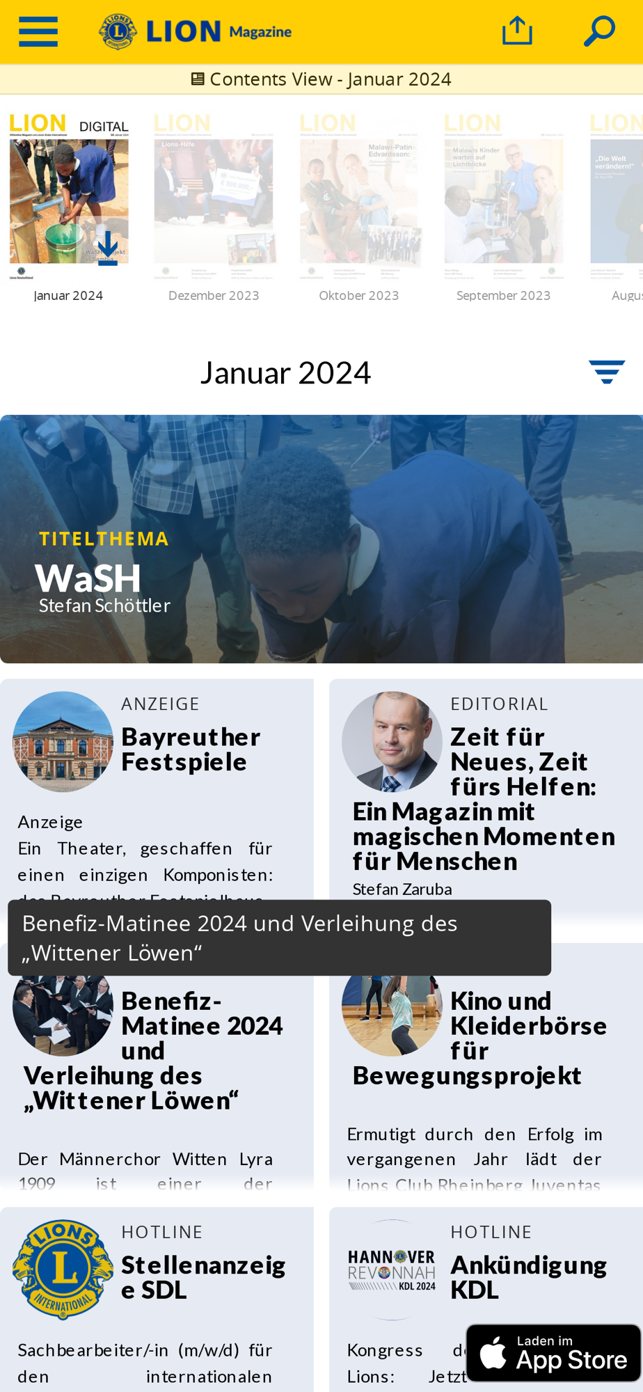 Das LION-Magazin verschafft Ihnen Einblick in die Hilfsinitiativen, um zu veranschaulichen, wie der Einsatz ehrenamtlicher Lionsmitglieder vor Ort und in aller Welt Berge versetzen kann. Erhalten Sie Zugriff auf interessante Erfolgsberichte und faszinierende Fotos, die den Einfluss der weltweit größten Hilfsorganisation verdeutlichen. Sowohl vor Ort als auch in aller Welt gehen Lions einige der größten Herausforderungen an, die sich der Menschheit stellen - Hunger, Augengesundheit, Umwelt, Kinderkrebs und Diabetes, um die Lebensbedingungen für alle Menschen zu verbessern. Wie sie das tun, erfahren Sie im LION-Magazin.
