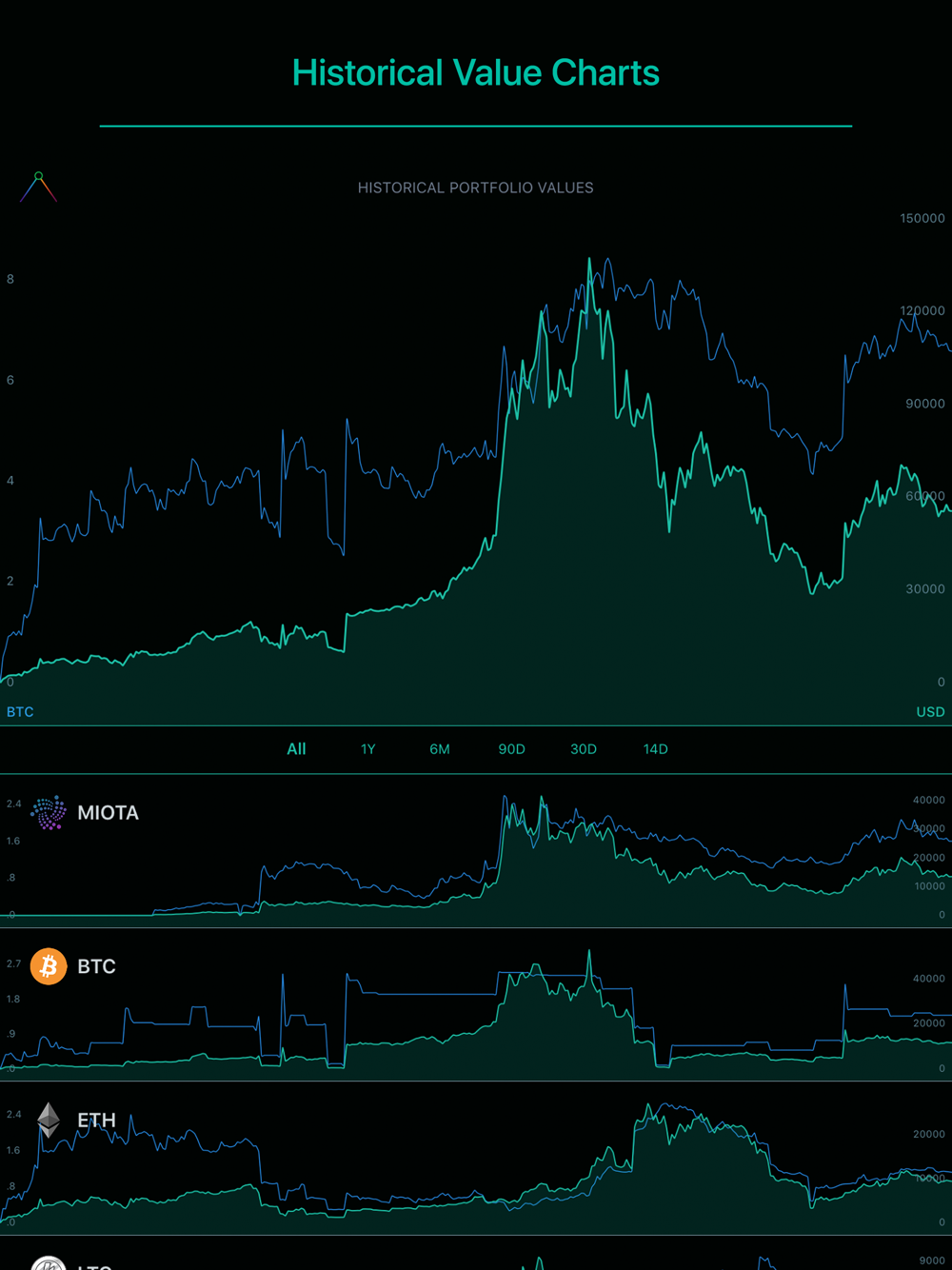 • Select two currencies to base your portfolio & market values. You can pick any combination of FIAT and Crypto, and change them at your convenience.