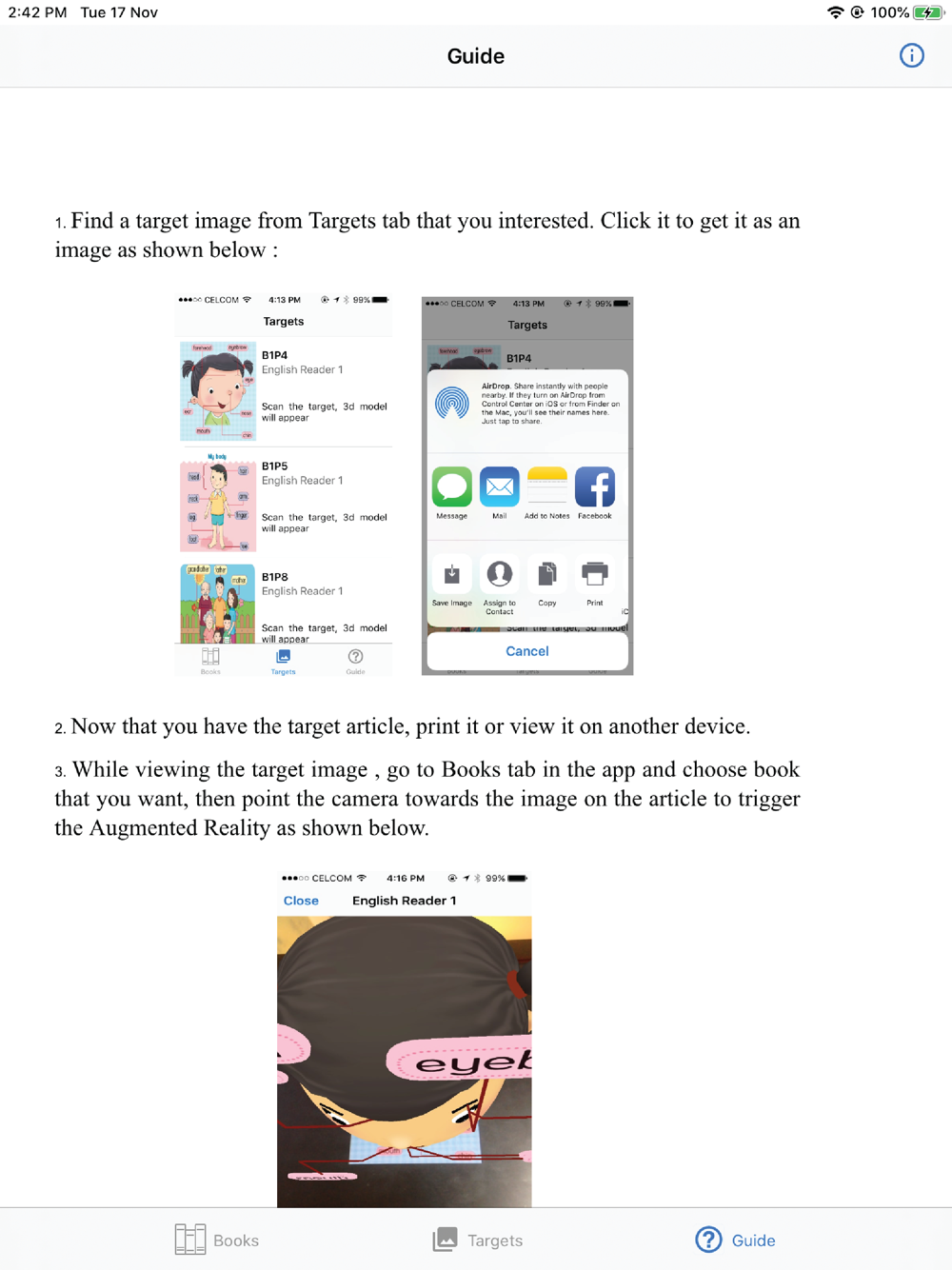 This augmented reality app is used in Malaysian textbooks for primary and secondary schools. It is to assist students in better understanding the subject in hand via 3-D modelling, videos, animation and audio.
