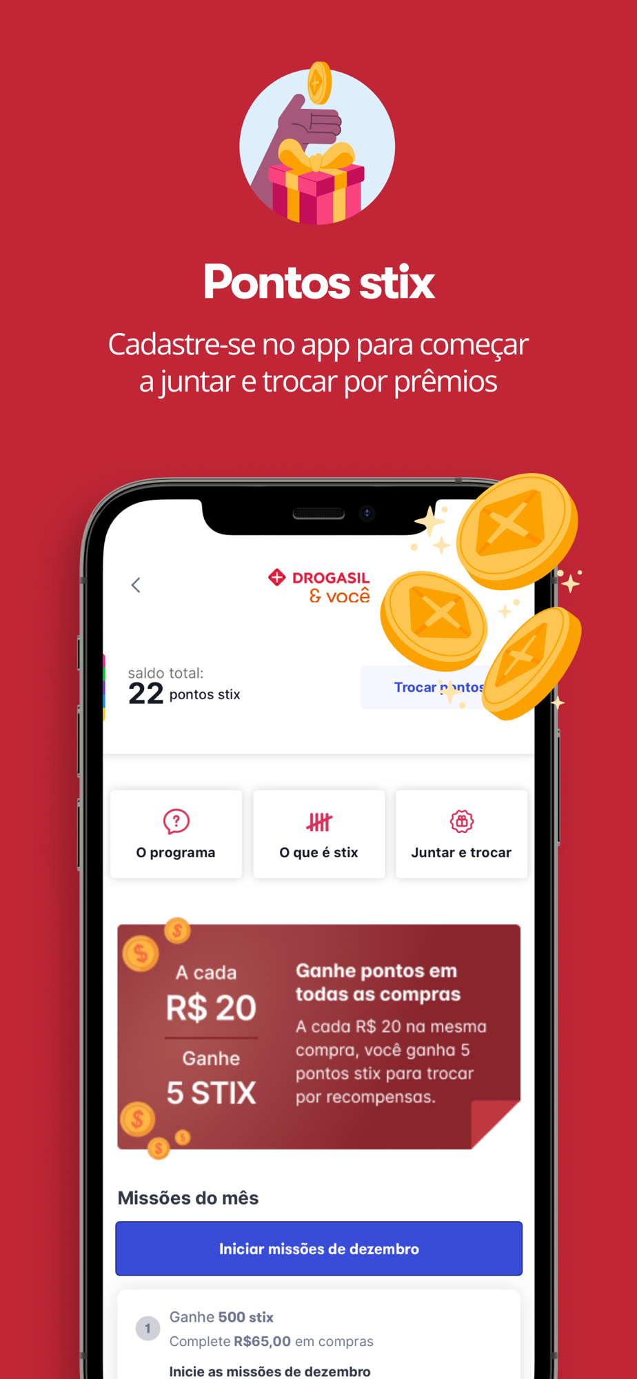 A Drogasil acredita em cuidado integrado com a saúde e, por isso, oferece uma série de benefícios que estão na palma da sua mão. Aqui você pode juntar pontos stix e trocar por prêmios ou até mesmo agendar o seu teste de COVID-19 de maneira rápida.