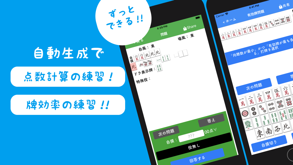 有効牌をベースにした何切る問題が自動生成で無限に楽しめるため、