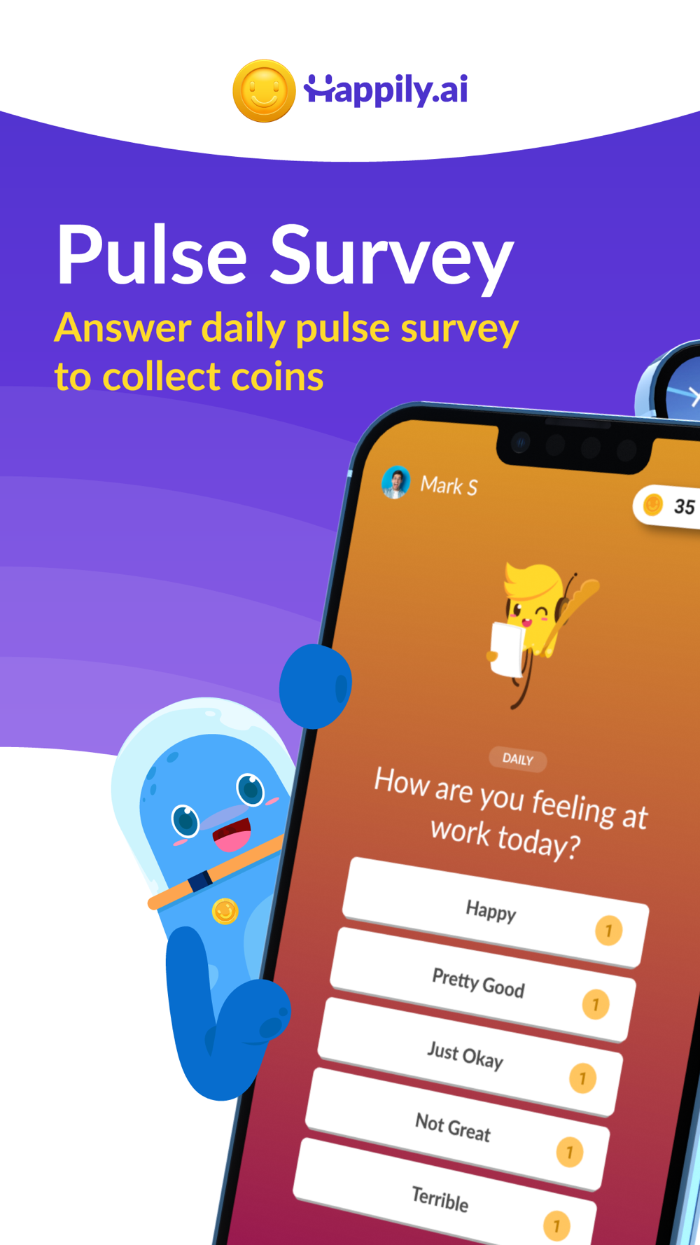 Happily is here to make work more fun and rewarding. Everyday, you'll be sent questions about how you feel at work and how you would like to improve your workplace.