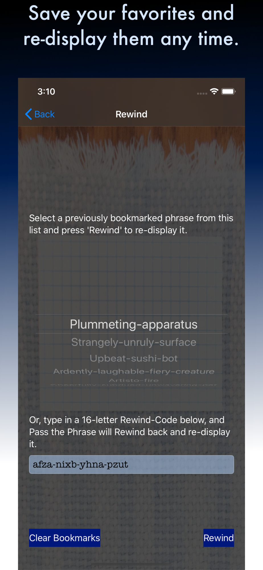 * Bookmark up to 10 of your favorite phrases, and then "Rewind" any time to bring any of them back and to show again.