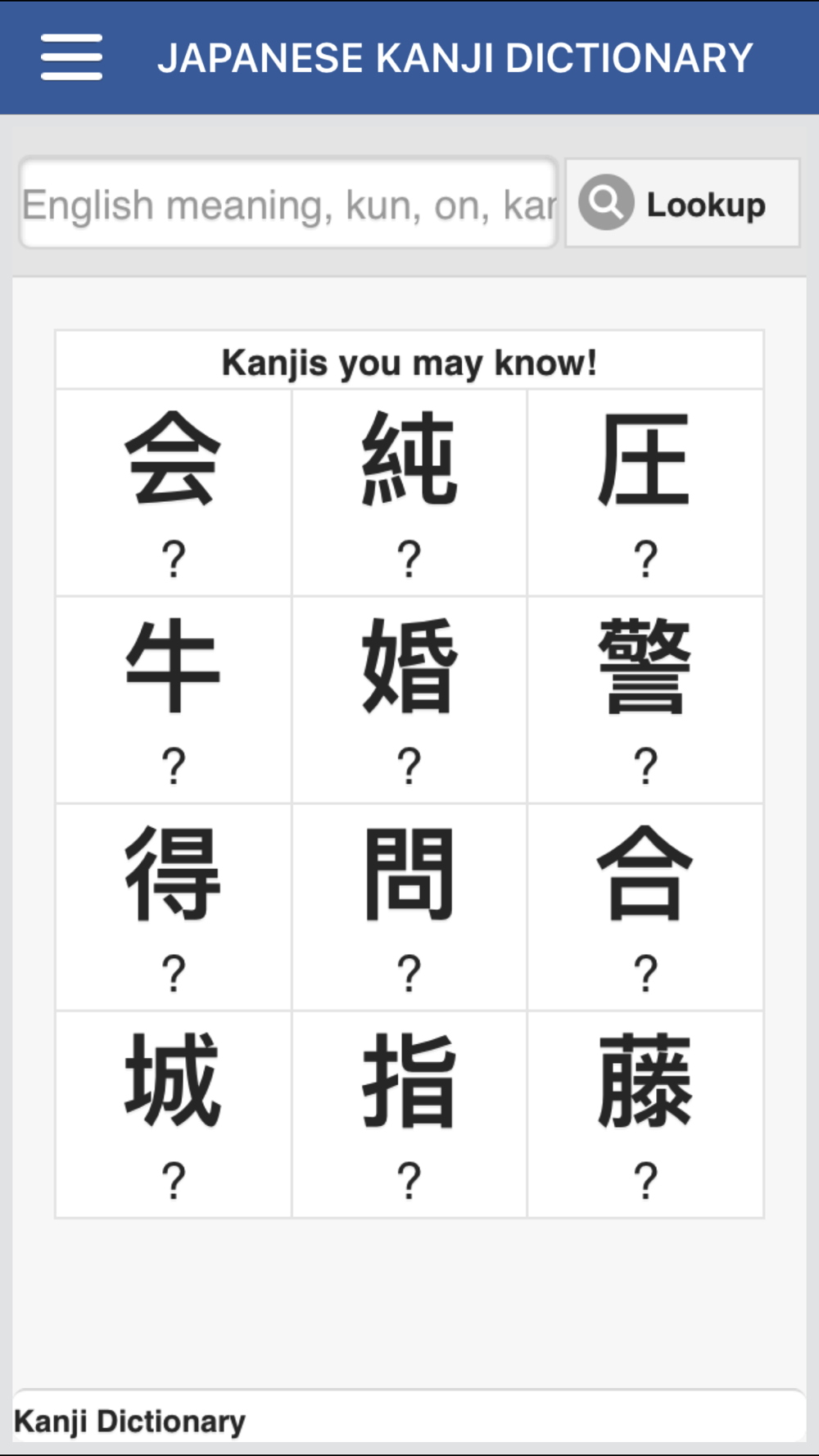 ••• Japanese Kanji Dictionary (JPLT N5-N1) is a helpful application to learn the Japanese language and prepare for the exam by studying Japanese vocabulary. It contains a list of over 20.000 words across all 60 lessons be interpreted clearly will help you become fluent in Japanese. Understand the basic concepts of Japanese words will help you learn Japanese easily. This app is an free offline application to help you learn Japanese vocabulary with a simple and efficient way. •••