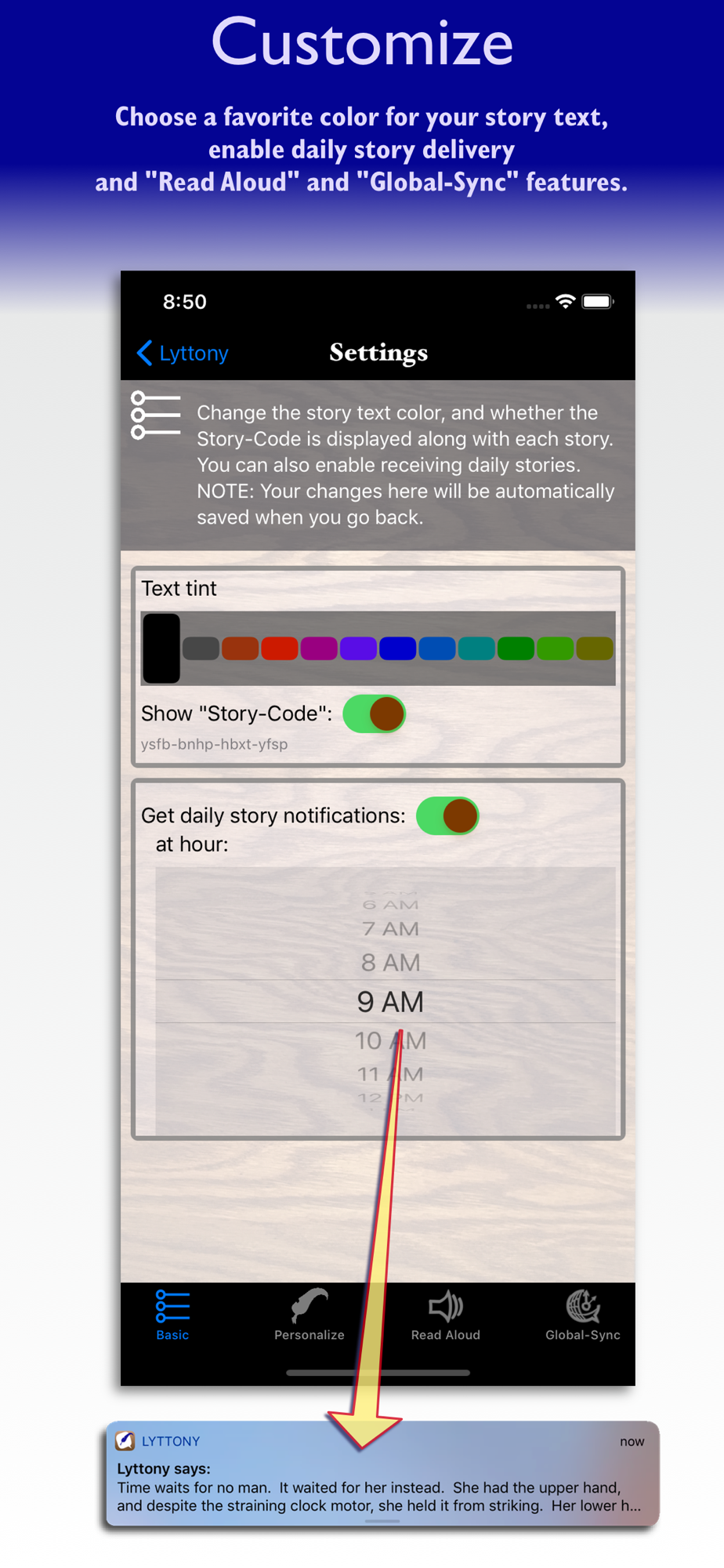* Global-Sync * Turn on Global-Sync mode and tap in to the "global story-cosmos." All Lyttony users around the world can get the same story at the same time, no matter where they live. So if you and somebody in another country both choose "every hour", then all Lyttony apps will dish out identical stories together every hour. Turn on Global-Sync, set the same time-frequency as your friends, and enjoy synchronized story time.