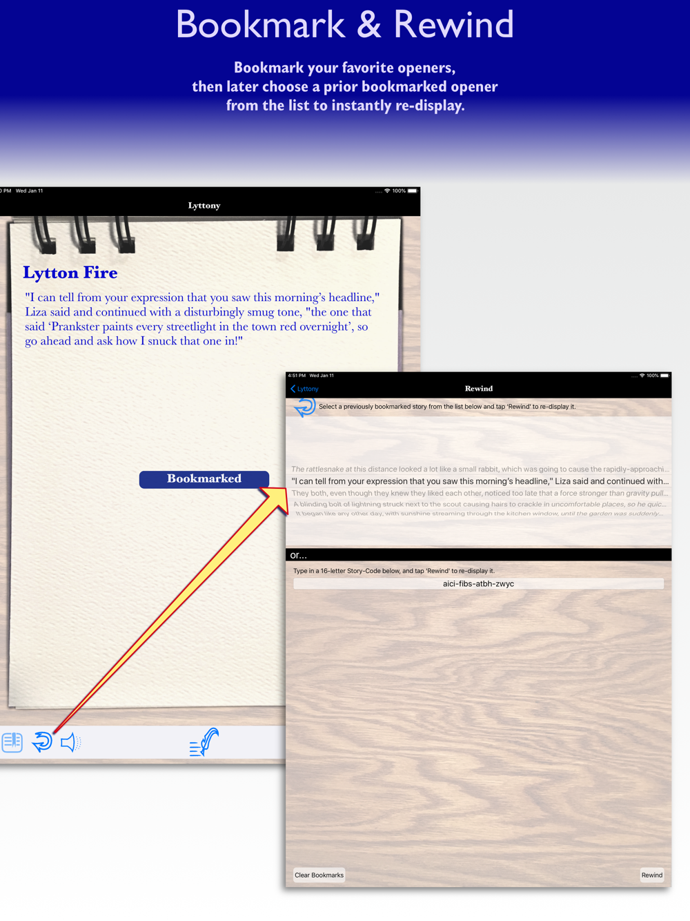 * Bookmark & Rewind * Bookmark up to 10 stories, then tap Rewind to choose a bookmarked story from the list and instantly re-display it. This is good for bookmarking/saving and revisiting prior funny ones, or sending the story-code to friends so they can jump to it it too.