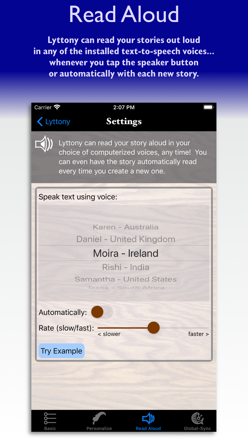 * Read Stories Aloud * Lyttony can read your stories out loud, whenever you tap the Speaker/Read button, or automatically with each new story. Tap Settings to choose from any of the installed text-to-speech voices.