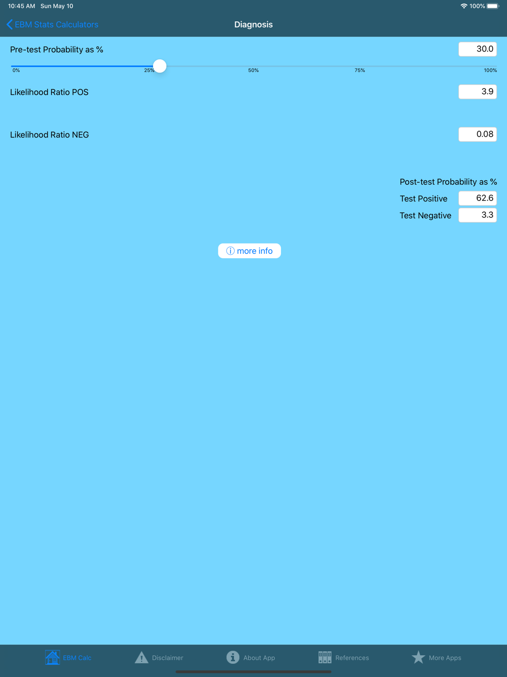 Although these calculators themselves are somewhat novel for apps, the unique tool in this app is for educators. Students and residents have a hard time understanding how the utility of a test can vary with pretest probability. Instead of saying it in words and hoping they get it, now you can demonstrate it. A test might perform well, giving good PPV and NPV, when pretest probability is in a certain range. But slide that pretest probability up or down and see the diagnostic utility change with the numbers flying right before your eyes. The tool also shows a student that in many cases, an imprecise estimate of pretest probability doesn't much matter. Different doctors might judge a clinical case to suggest likelihood of disease (pretest probability) of 40%, 50%, or 60%. The slider tool shows that the differences may not matter, and the test in mind will render good clarity regardless of differing opinions on pretest probability.