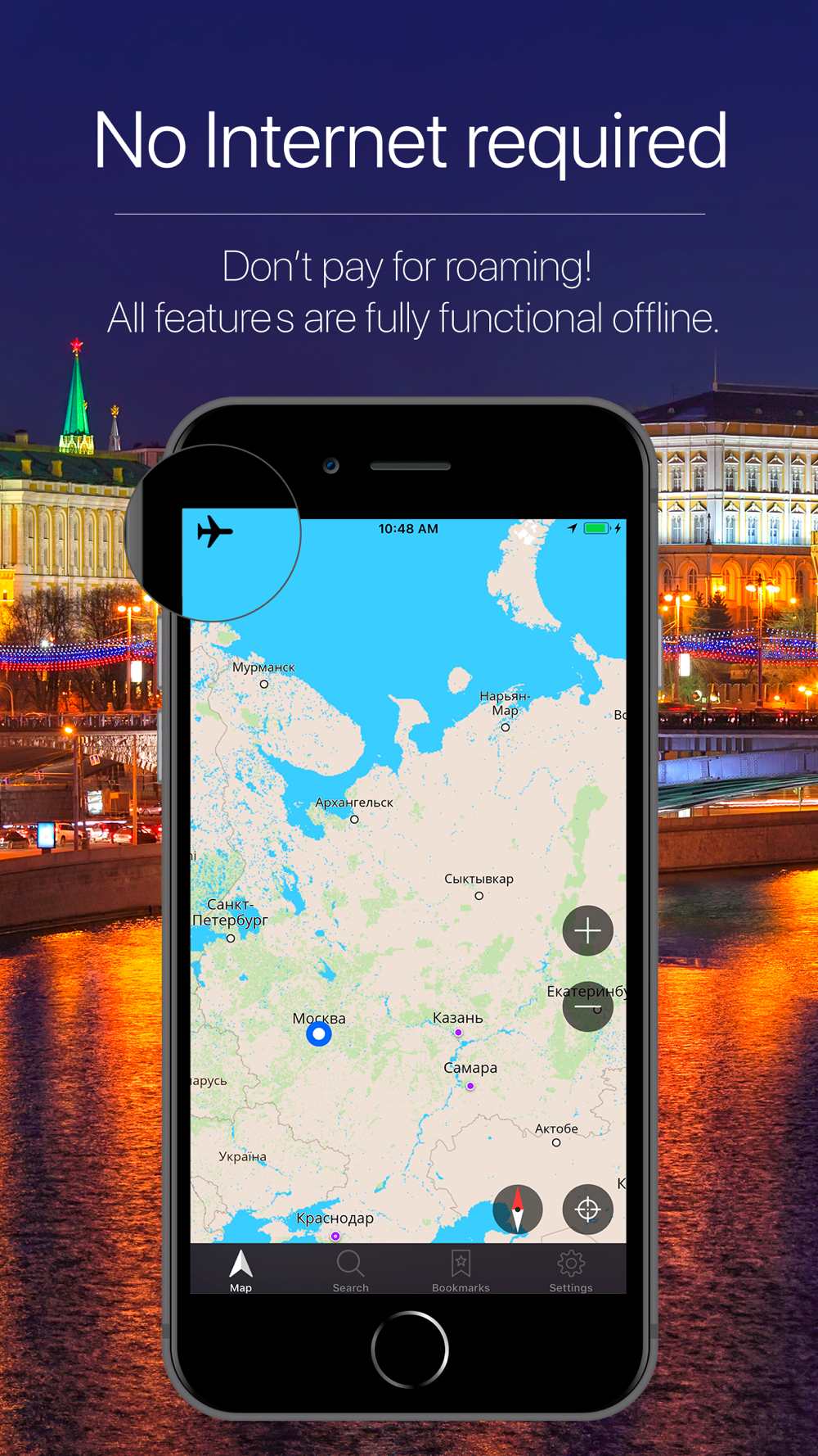 The App contains detailed maps of the biggest cities in Russia: Moscow, St Petersburg, Novosibirsk, Yekaterinburg, Nizhny Novgorod, Samara, Omsk, Kazan, Rostov-on-Don, Chelyabinsk and others.