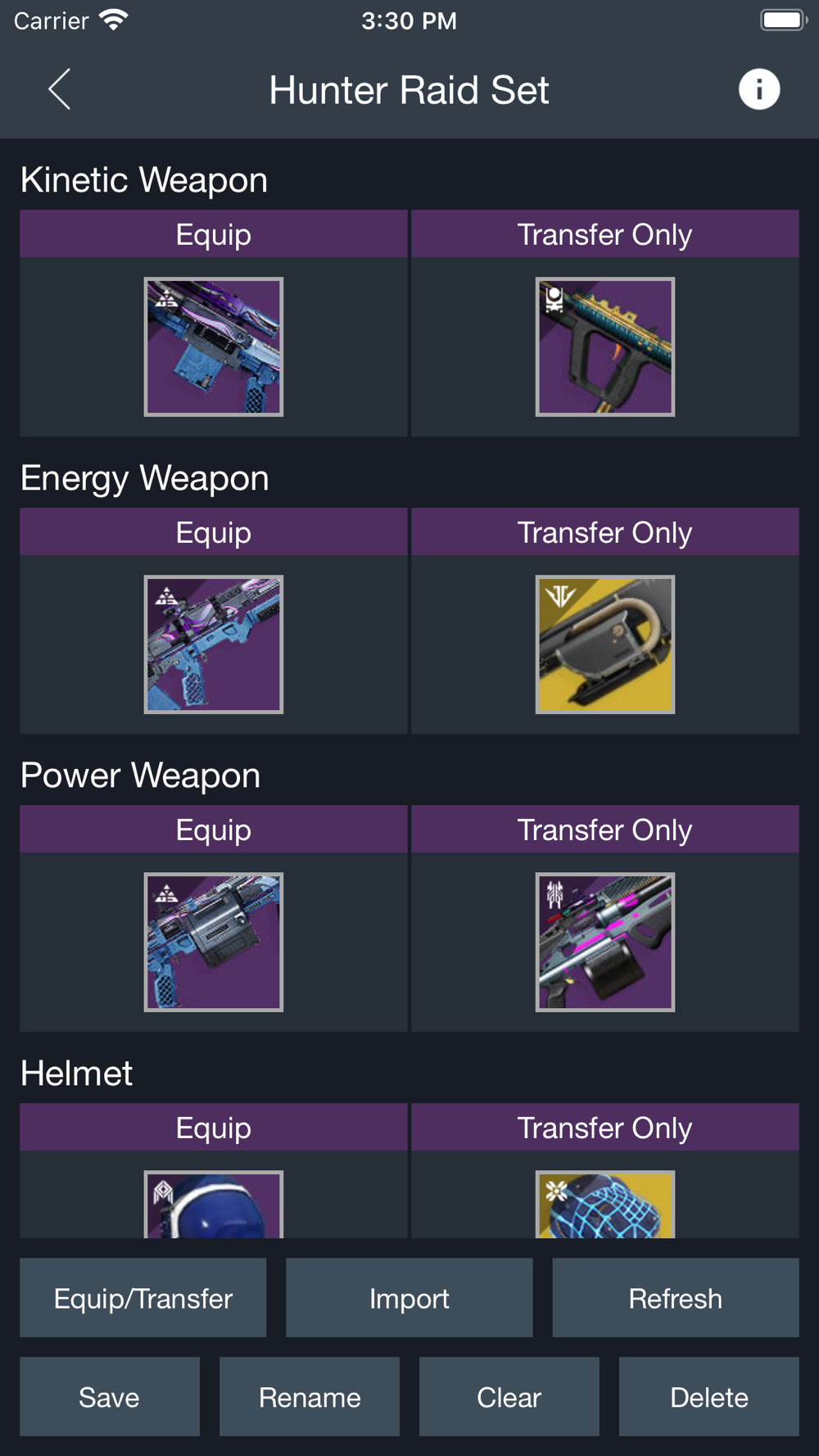 Loadout Manager automatically finds your saved set items whether they are on another character or at your vault; transfers them and equips them to your Guardian. All with just one tap of a button!
