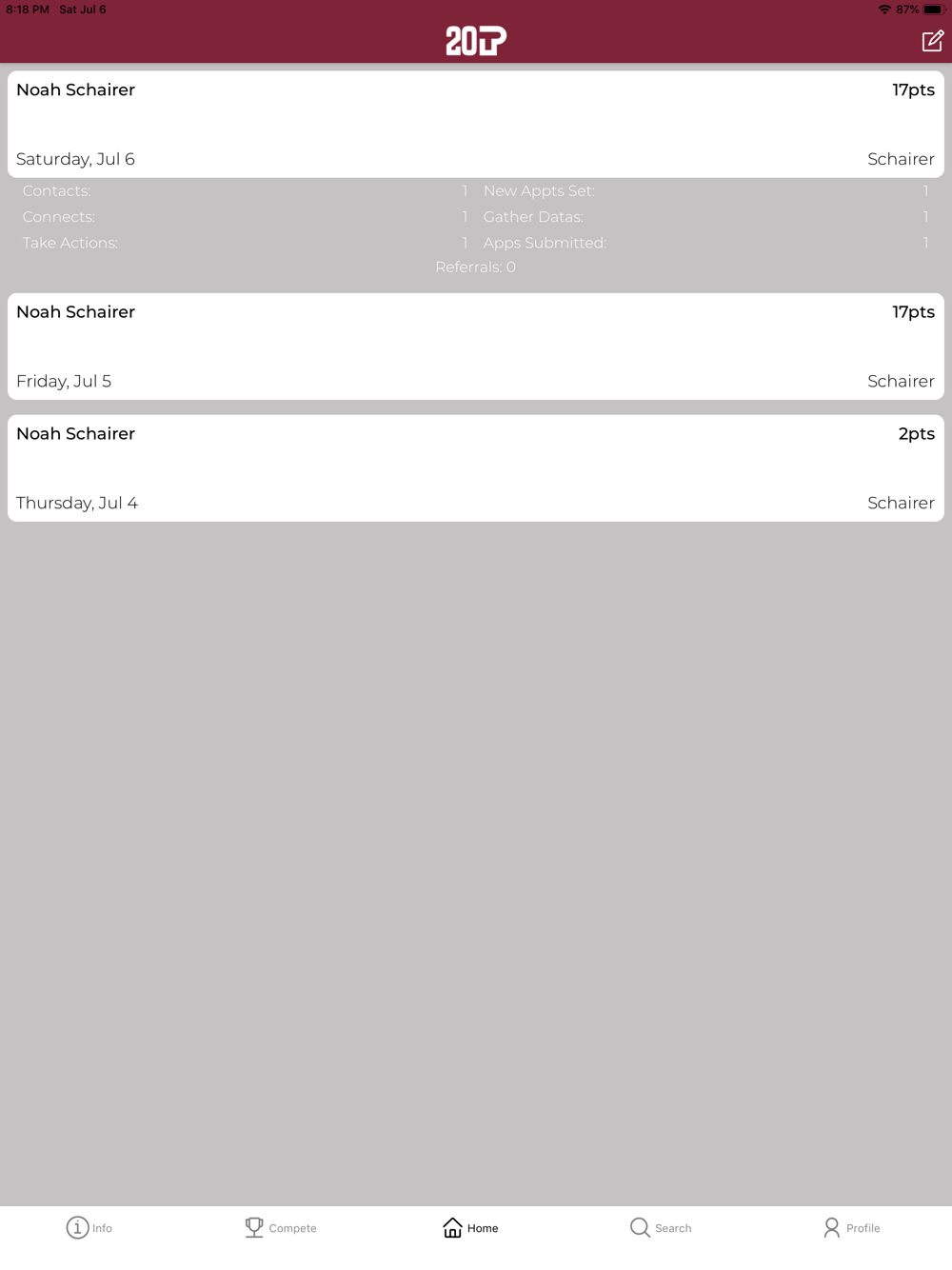 The 20 Point Tracker allows you to keep track of your activity via a 20 Point System. With a live feed of every users activity broken down into subtopics, you can manage FR's activity daily.