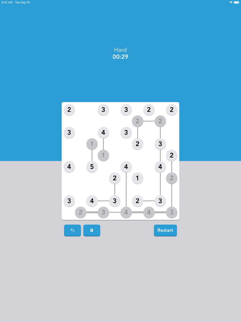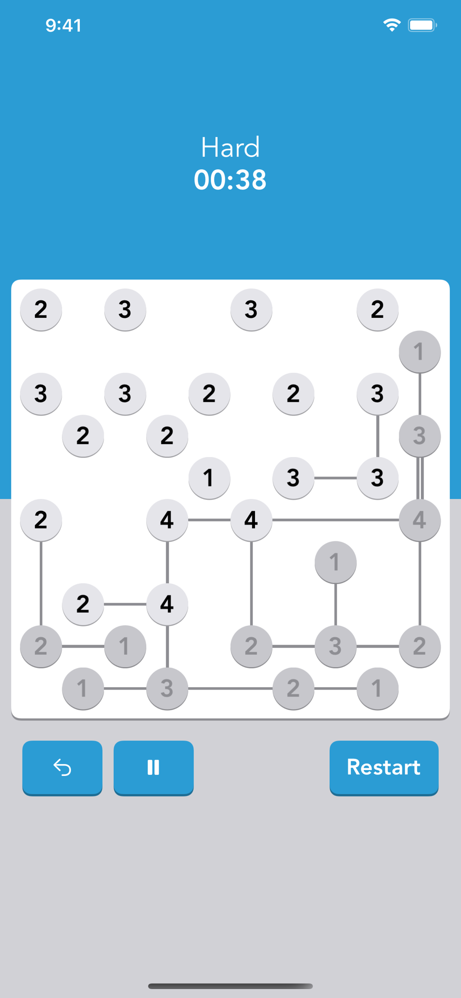 Connect each island by drawing bridges between them. The number of bridges connected to each island must match its number. To finish the game, the islands must be connected in a continuous path, subject to the following constraints: