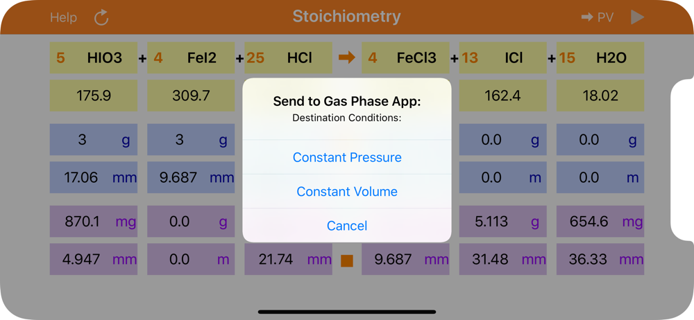 App can send the data to Gas Phase Stoichiometry app to further calculate pressures and volumes of gaseous compounds.