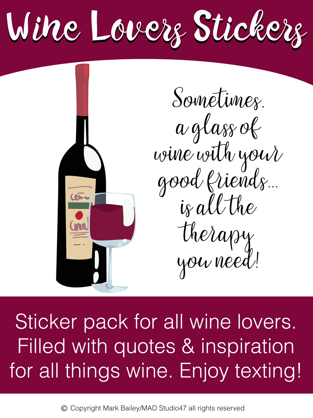 For all the wine lovers :) There are 40 total stickers in the pack. Now go enjoy a glass of wine and enjoy texting with your family & friends!