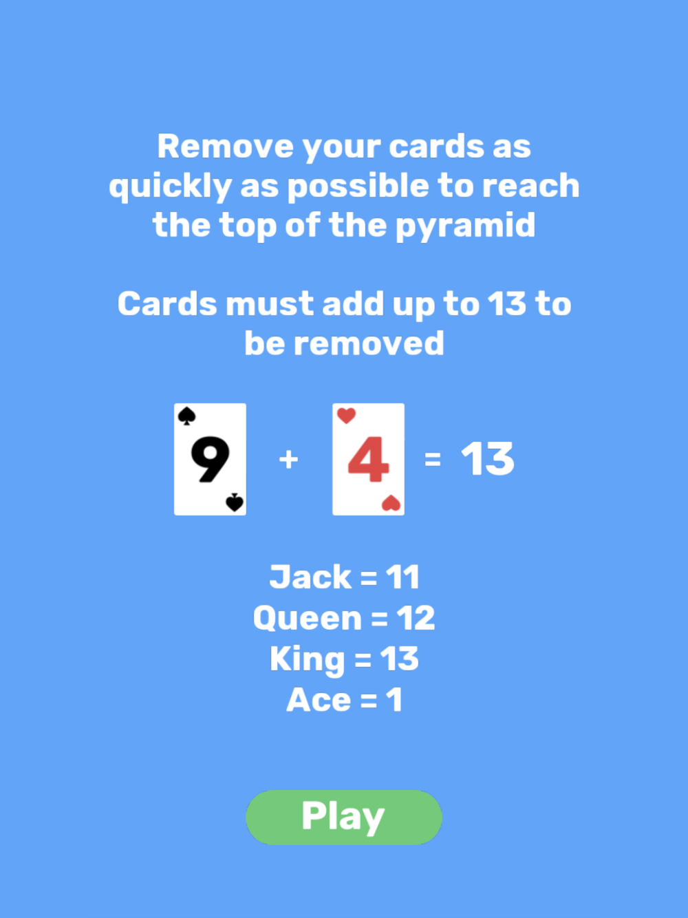 Simply match cards together that equal 13 to make them disappear, work your way up the pyramid until you've cleared the board!