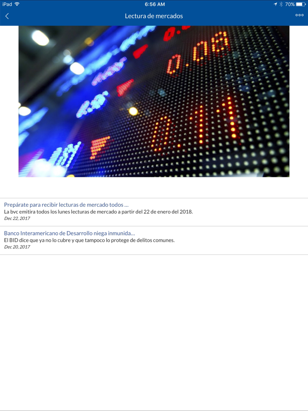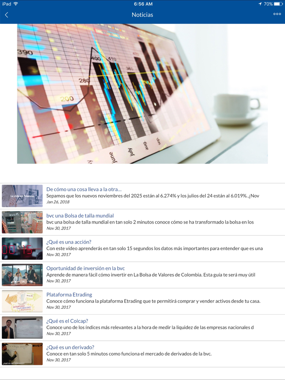 - La aplicación incluye documentos de apoyo relacionados a temas financieros, noticias de los mercados relacionados, herramientas de apoyo para conocimiento sobre el mercado de capitales (Simulador de negociación), asistencia virtual, tendencias, gráficas del mercado, entre otras.