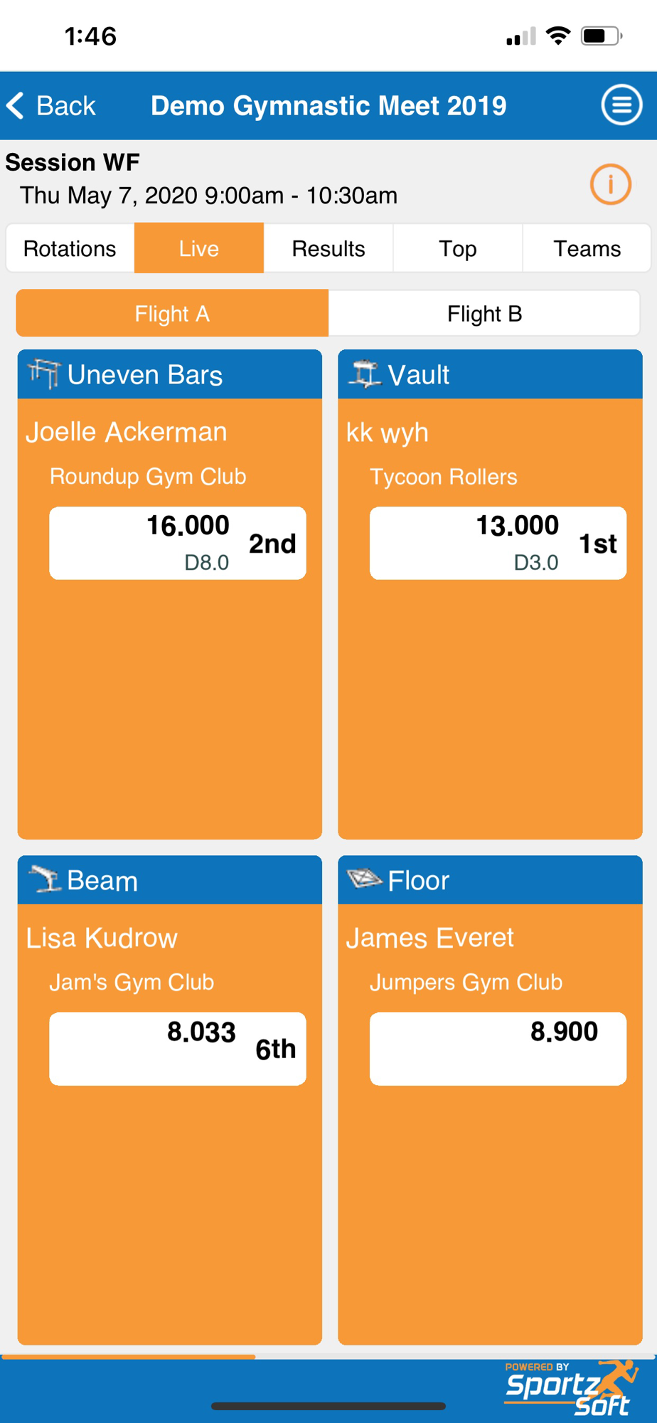 Provides easy access to current meets that are active, as well as the ability to search for other meets by region and timeframe. Each meet provides live scoring and results by session.