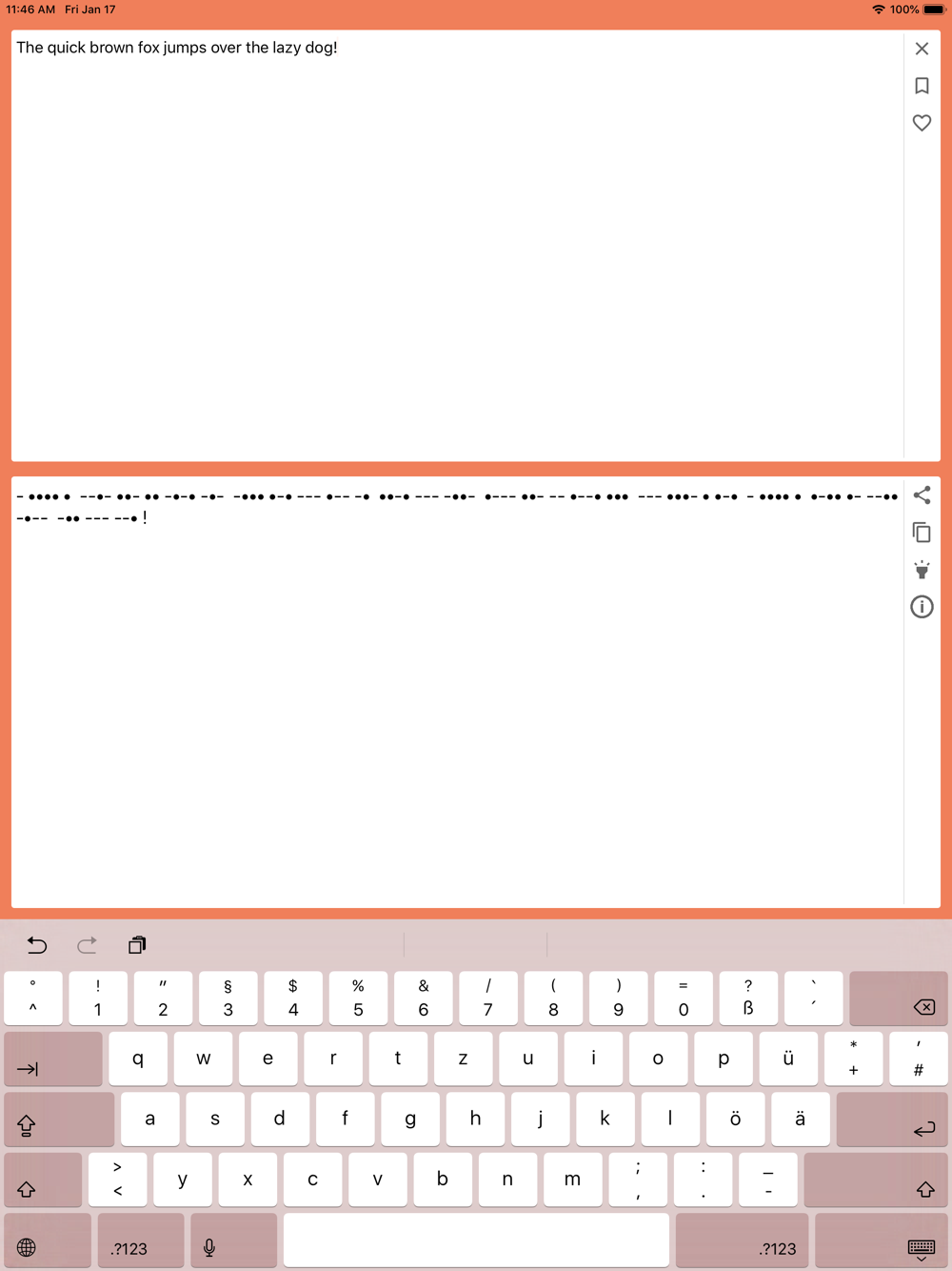 Converts text into morse code. Morse code can be transmitted using the flashlight of the device.