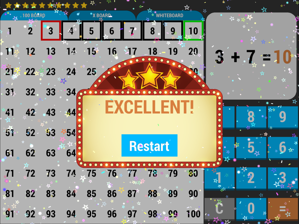 Easily generate math facts equations to practice. Differentiate and adapt to your learners’ needs with the flexible settings. Visualize the equations with the hundred board, multiplication board, or the white board. With a switch of a button, see 100 board visualization come to life! The goal is to help learner acquire understanding of what the equation means in terms of quantity, number recognition, number meaning and operations. Once understanding is gained, learner will benefit from math facts practices, focussing more on mental math, memorization, speed and accuracy. Mastering math facts helps build a strong math foundation and ensure success in math related life skills such as handling money, telling time, and understanding temperature.