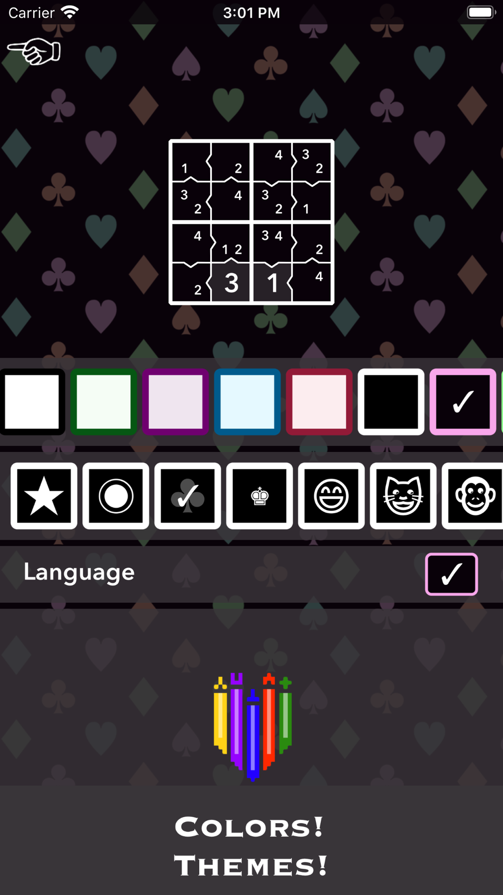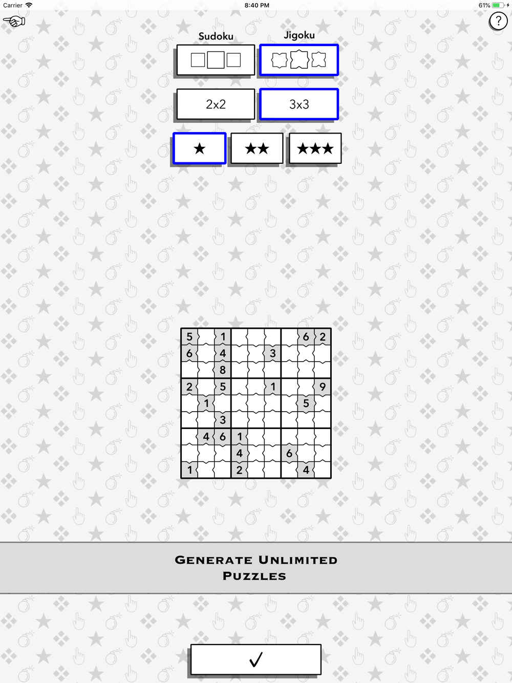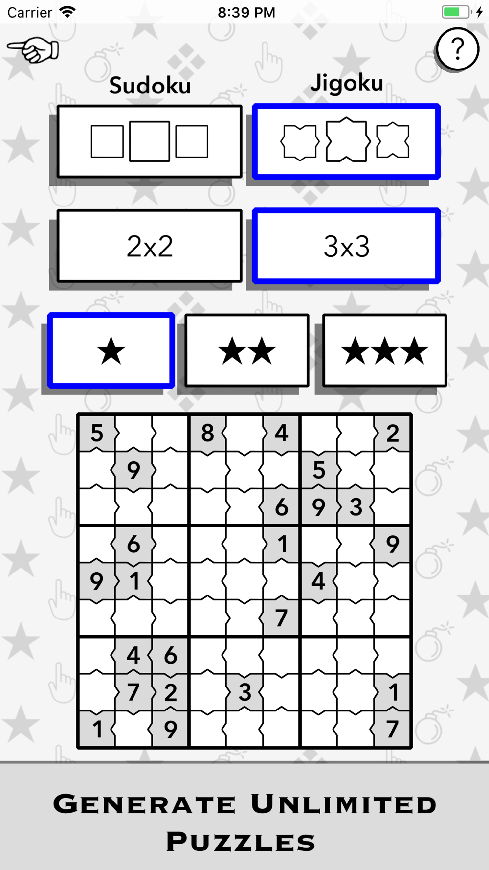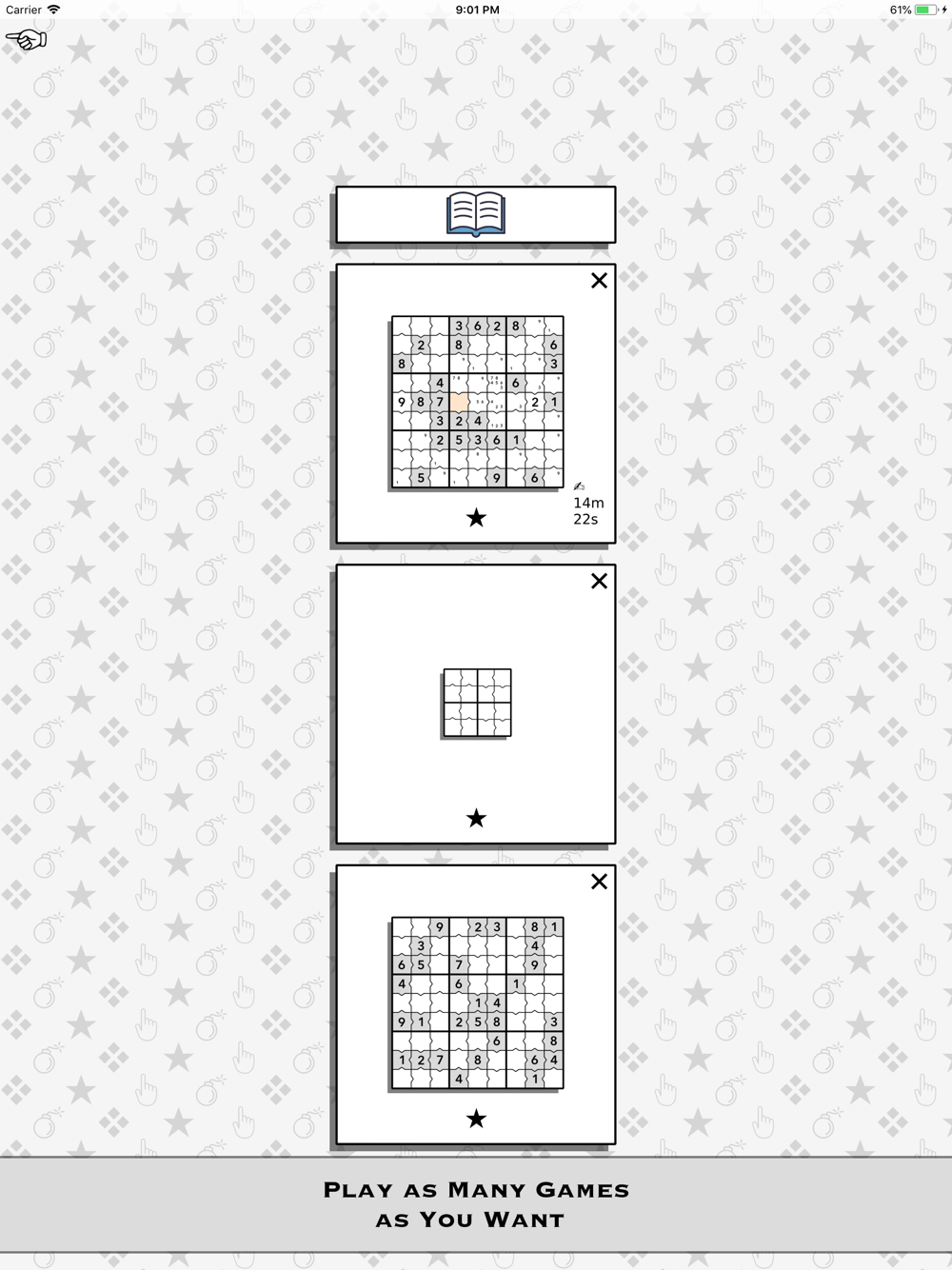 • Support for both Sudoku and Jigoku games, 2x2 and 3x3 games, and varying levels of difficulty.