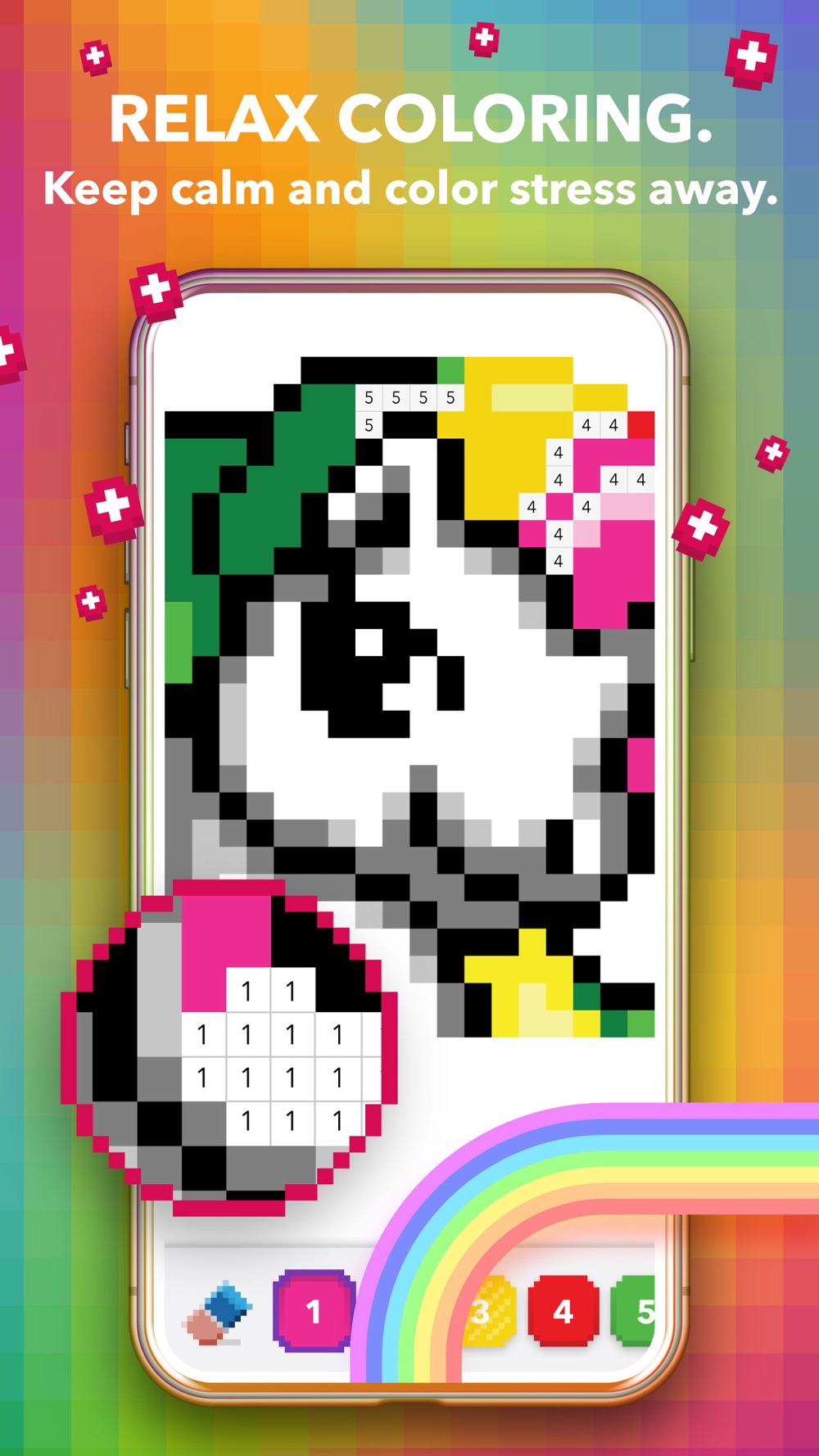 Feeling stressed or anxious? Color by number with Rainbow coloring book to help you calm down and relax when you’re angry or stressed. It will restore your sense of balance by mentally stimulating and challenging you to find the number and color the picture. The game is simple: fill all the pixels in the picture with their correct colors.
