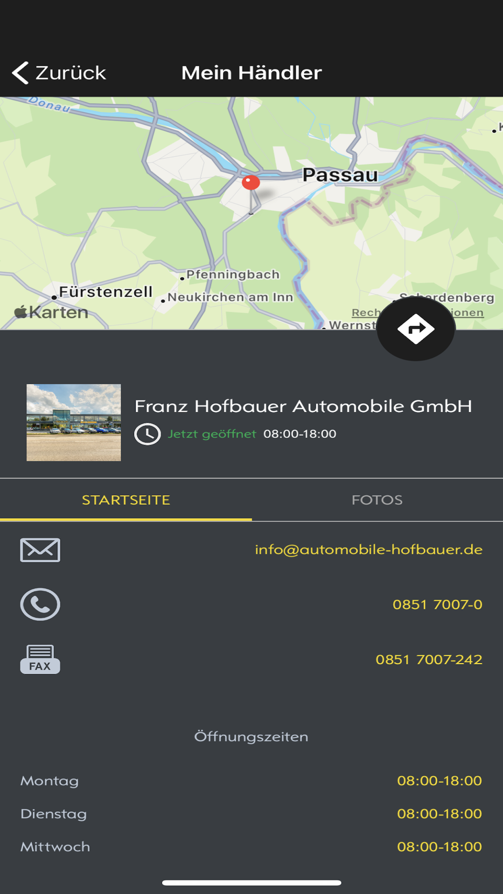 Sie haben in Notfällen alle wichtigen Kontaktdaten zur Hand. Per „Klick“ rufen Sie Ihr Autohaus an oder schreiben eine E-Mail an Ihren Verkaufsberater.
