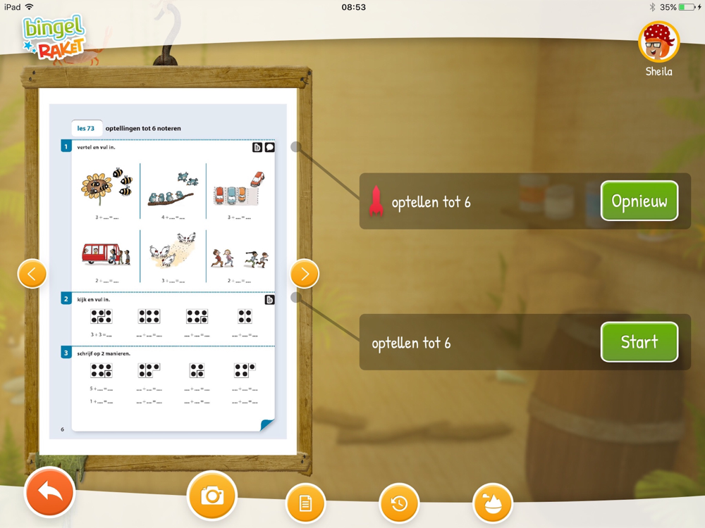 Wanneer de raket is opgestegen zie je meteen welke bingel-oefeningen bij de oefeningen in je schrift horen. Oefeningen die je al eens gemaakt hebt, kun je opnieuw maken. De kleur van de raket toont je hoe goed je het deed.