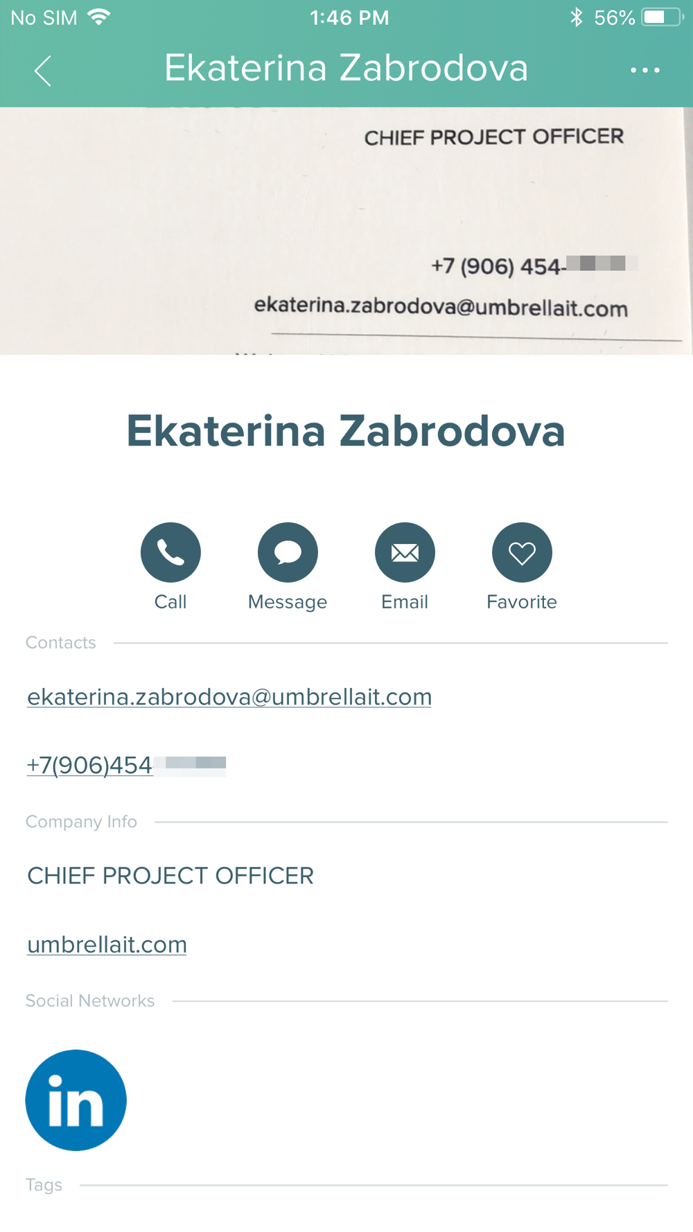 Nowadays you can do networking in any part of the world and the only thing you always have at hand is your smartphone. Therefore we have developed TakeMyCard app which allows you to сreate your business cards and send them over any distances with one device.
