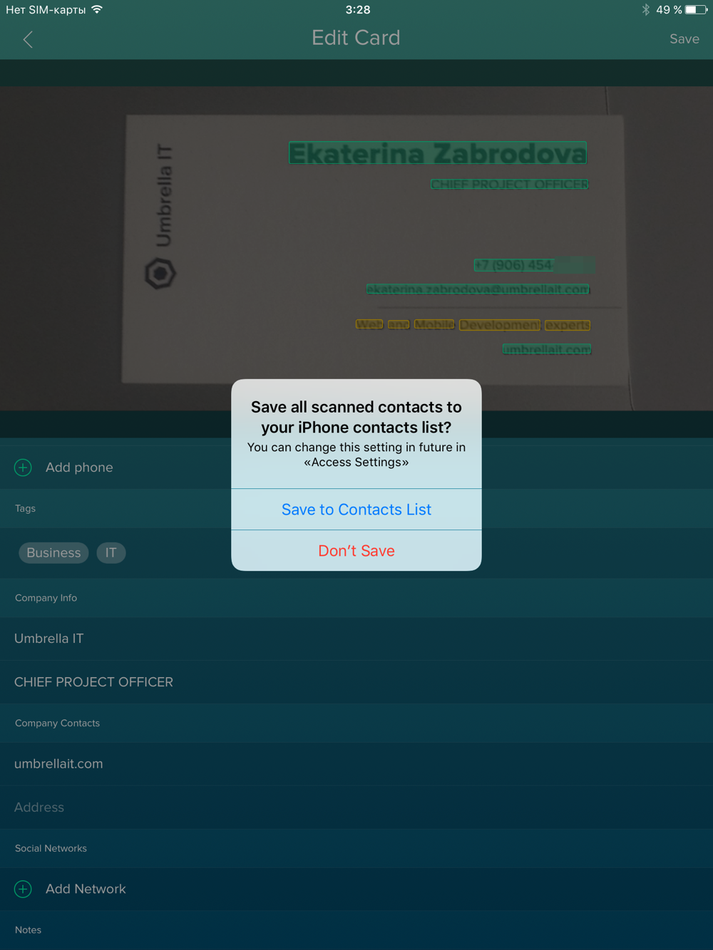 In addition, we offer you a possibility to scan paper business cards and save them in the App.