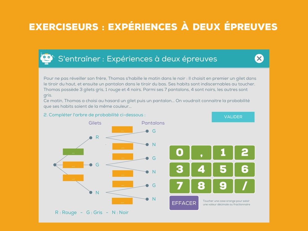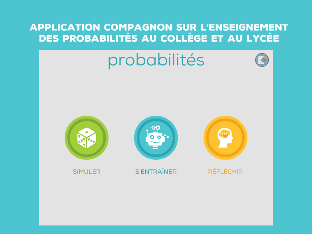 Probabilités est une application compagnon pour l’enseignement des probabilités au collège et en seconde. Elle est composée de trois grandes parties : Simuler ; s’entraîner ; réfléchir