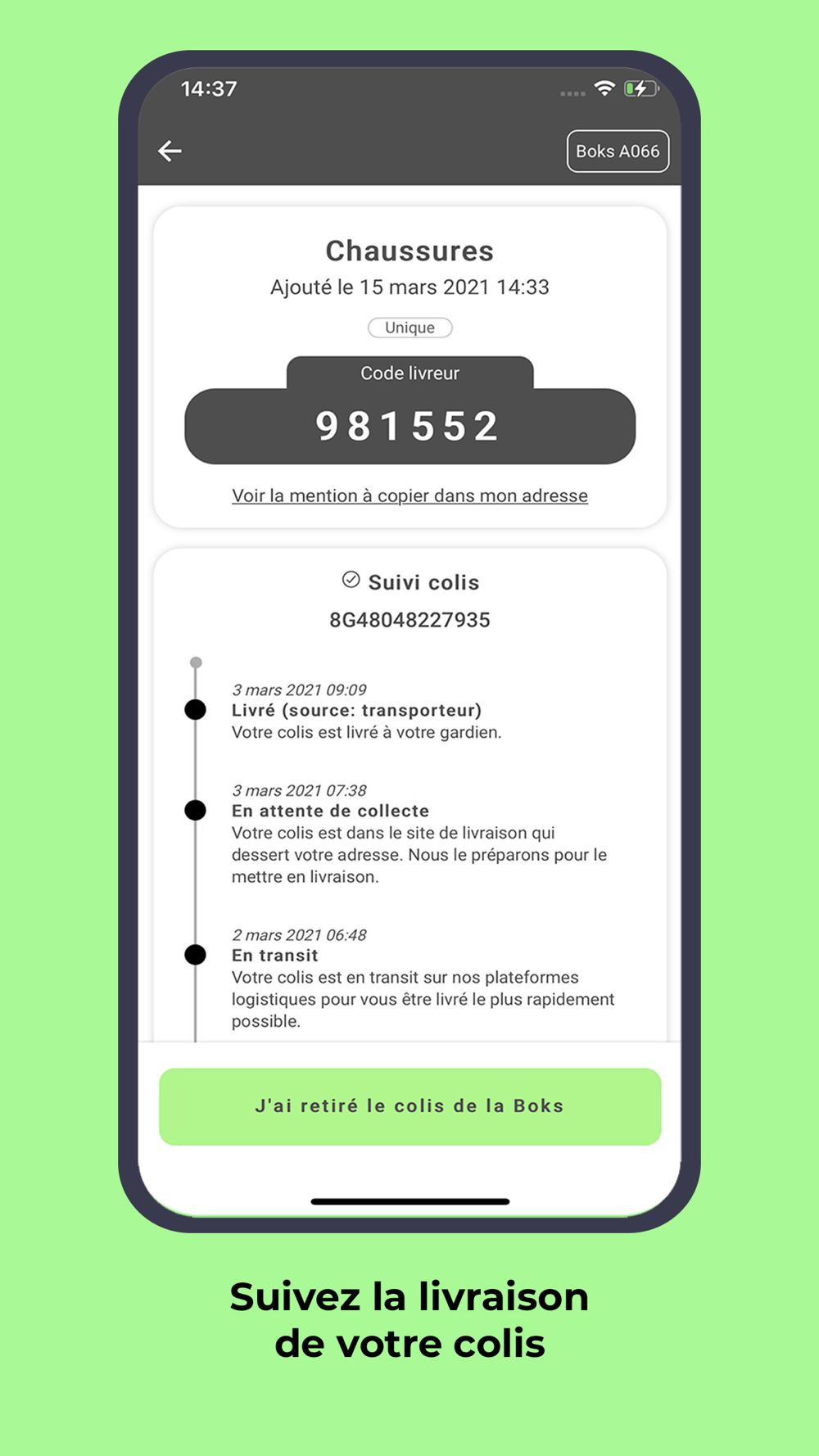 - Téléchargez notre application mobile gratuite pour vous enregistrer sur votre Boks via votre smartphone. Cela vous permettra de piloter votre boîte à colis en quelques clics (réception, suivi, envoi et retour de vos colis),