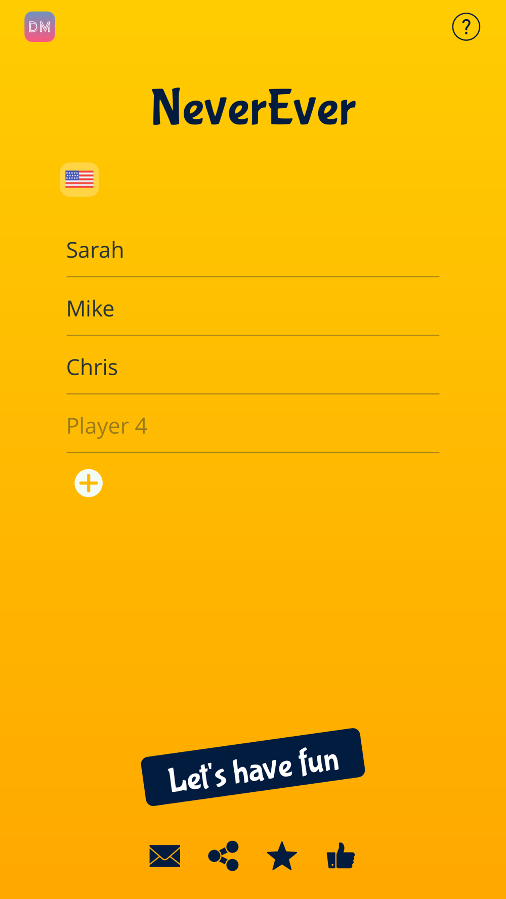 Just add each player's name and NeverEver will take care of the rest! Follow the instructions, no matter how crazy they get!
