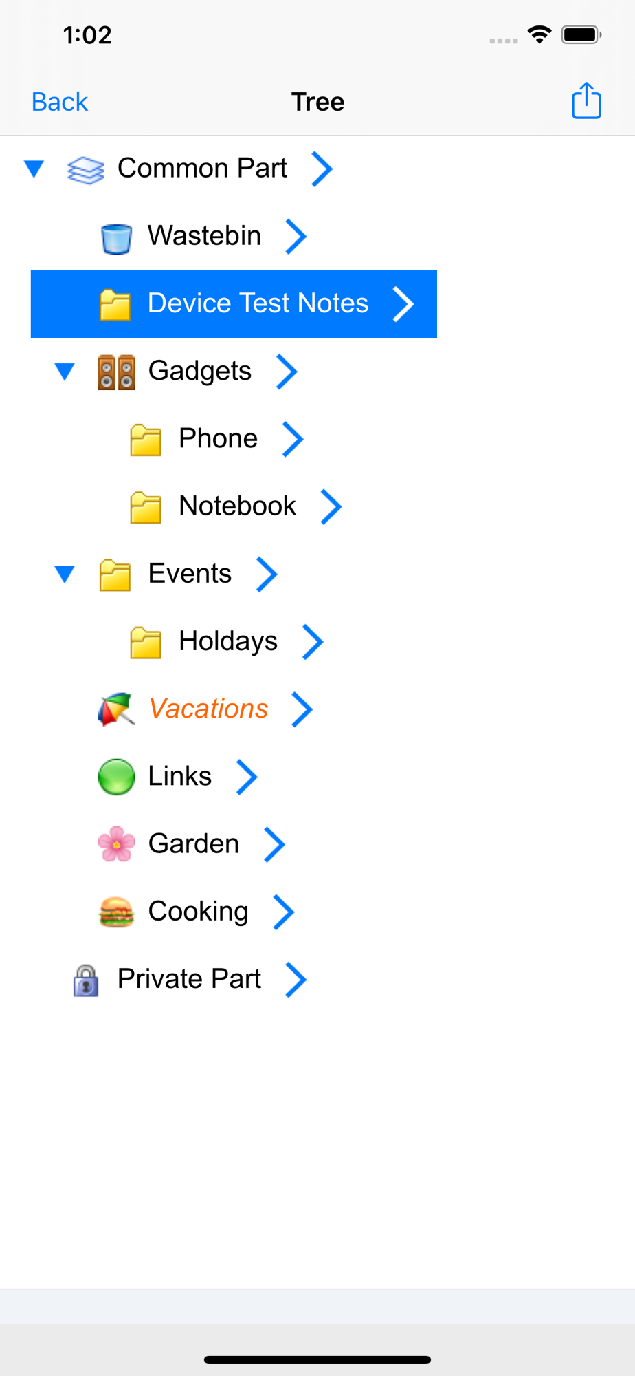 The data in every part is arranged as a tree-like multilevel hierarchy of folders and notes.